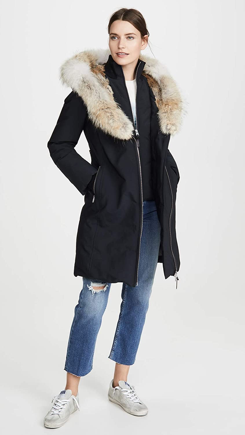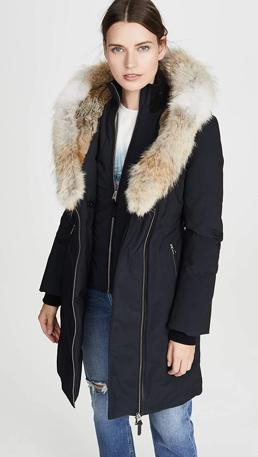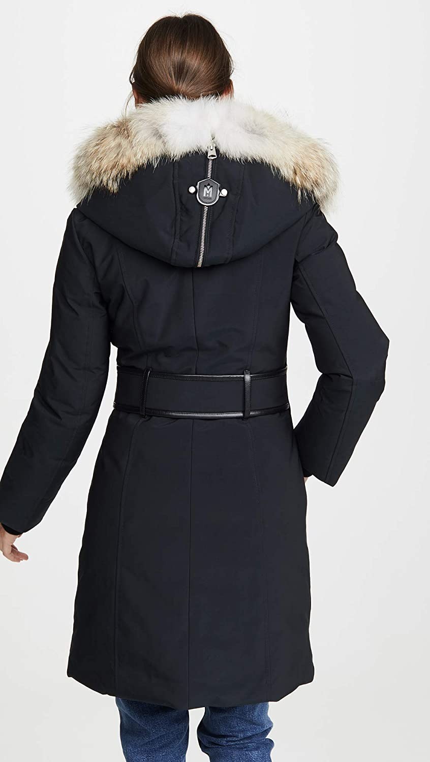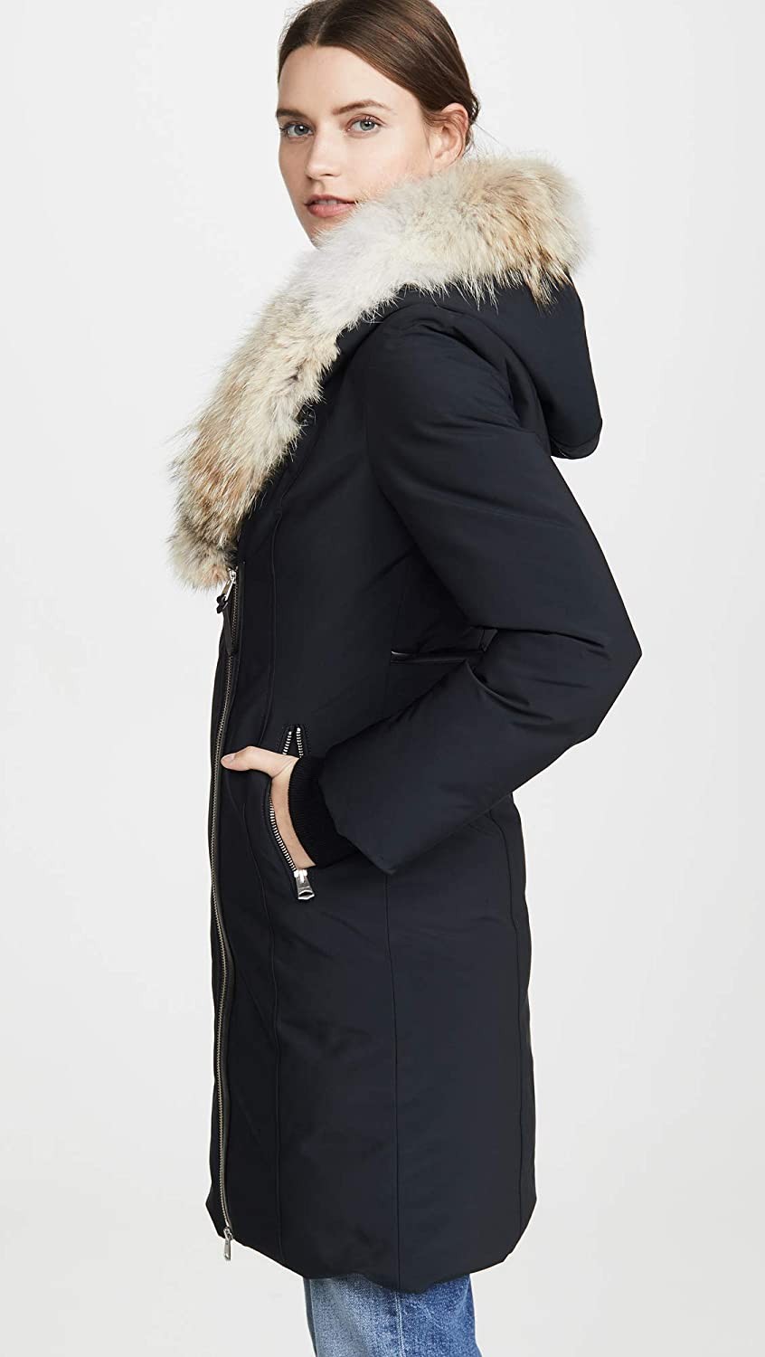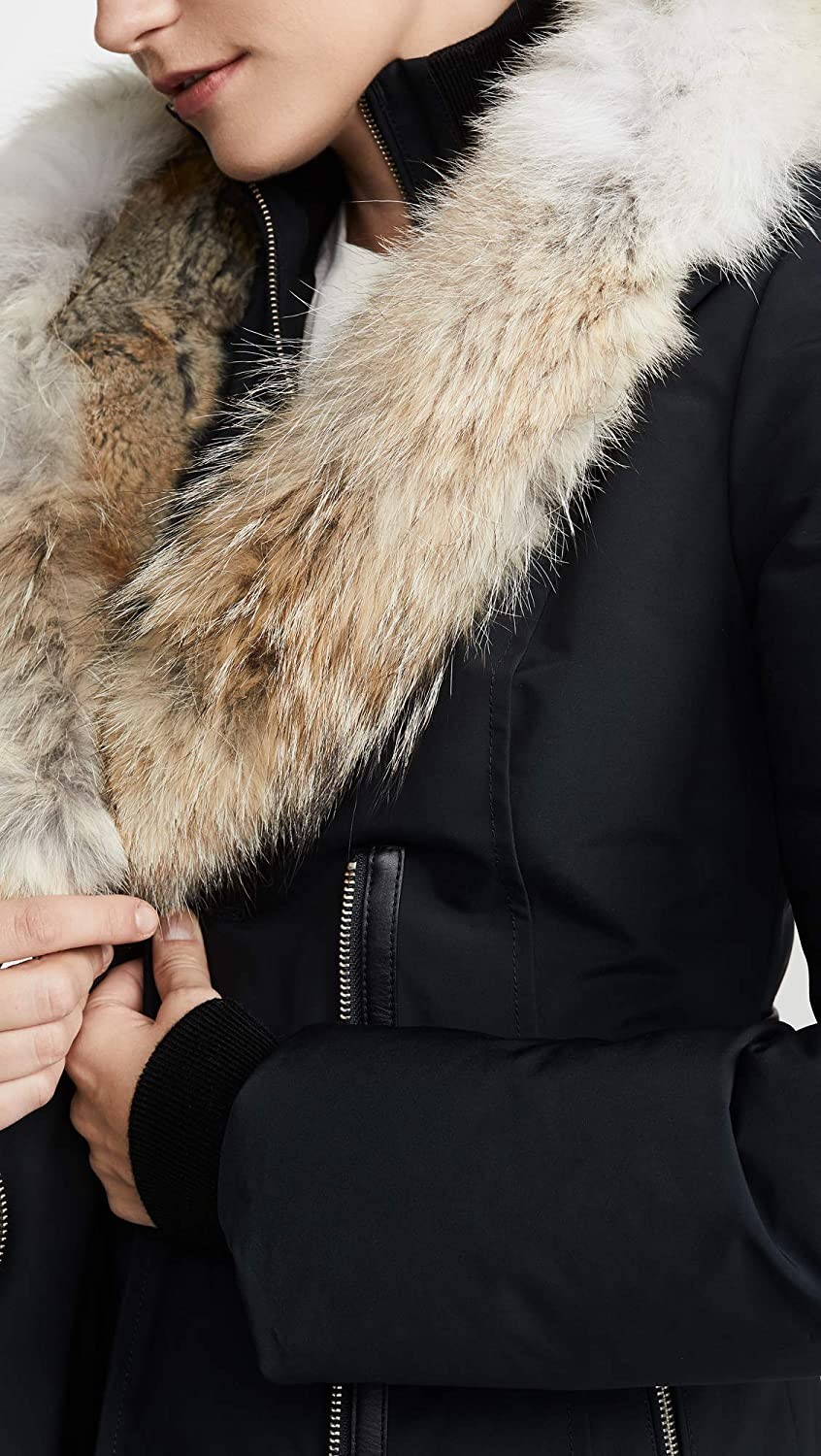 Ladies classic Mackage fitted down coat with fur trimmed hood