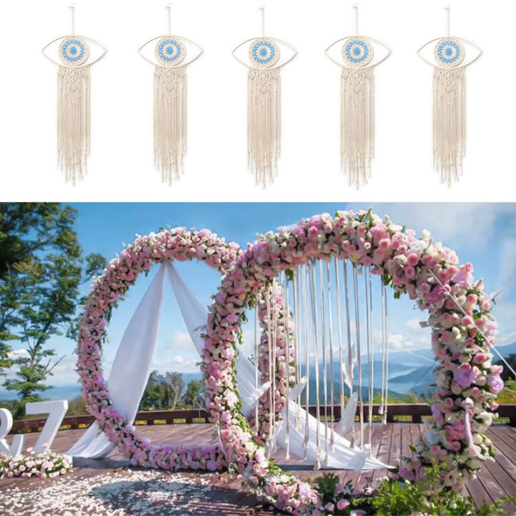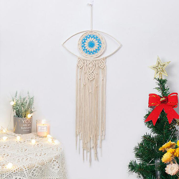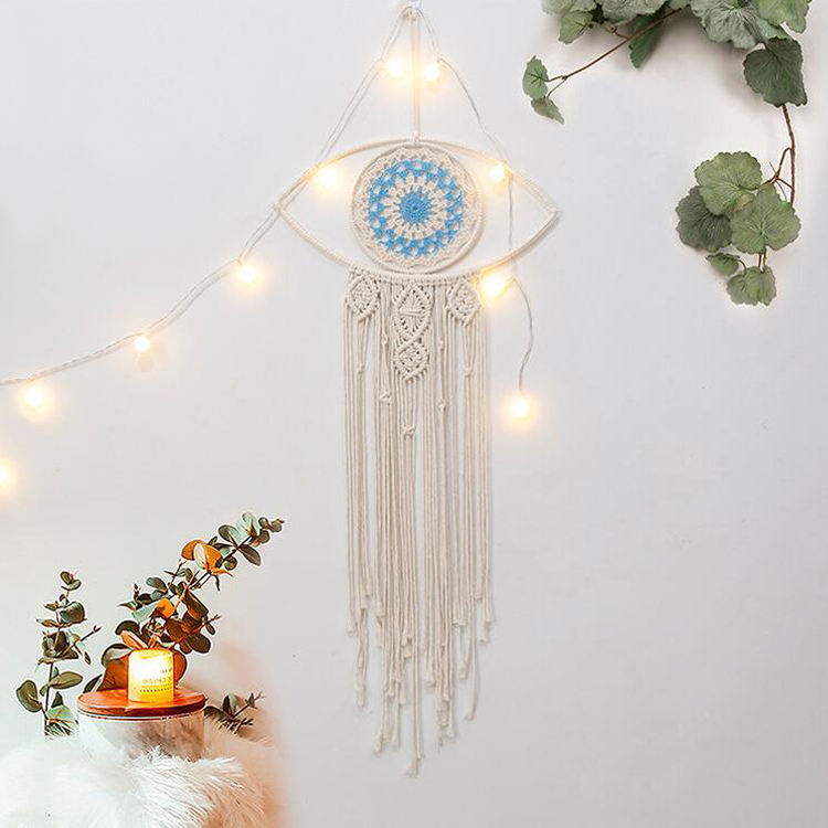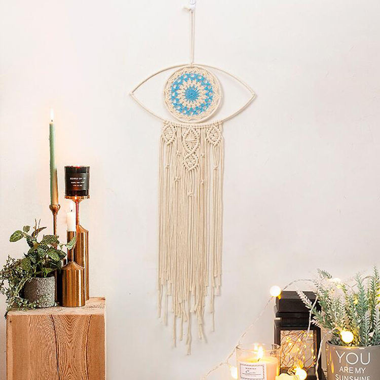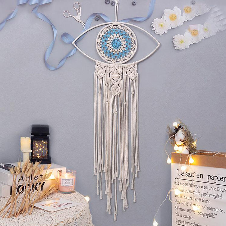 Essential details Place of Origin: Zhejiang, China Brand Name: None Model Number: BJ-559 Material: cotton rope Usage: home decoration, All people Shape: Round Pattern: macrame Format: handmade Technics: crochet Theme: Art Function: MOVABLE, hanging Design Style: Bohemian, Farmhouse, Country, Art Decor, Vintage, Children's, Modern Product Name: Evil Eye Dream Catcher Color: Subject to picture color Height: 90 cm (35.4 inch) Ring diamete: 34-18cm (13.38-7 inch) Weight: About 185g Gift: Super Suitable Application: decoration for Bedroom,Baby tent,Sitting room,Balcony Packing: Customizable Commercial Buyer: Restaurants, Specialty Stores, TV Shopping, Department Stores, Bubble tea,Juice