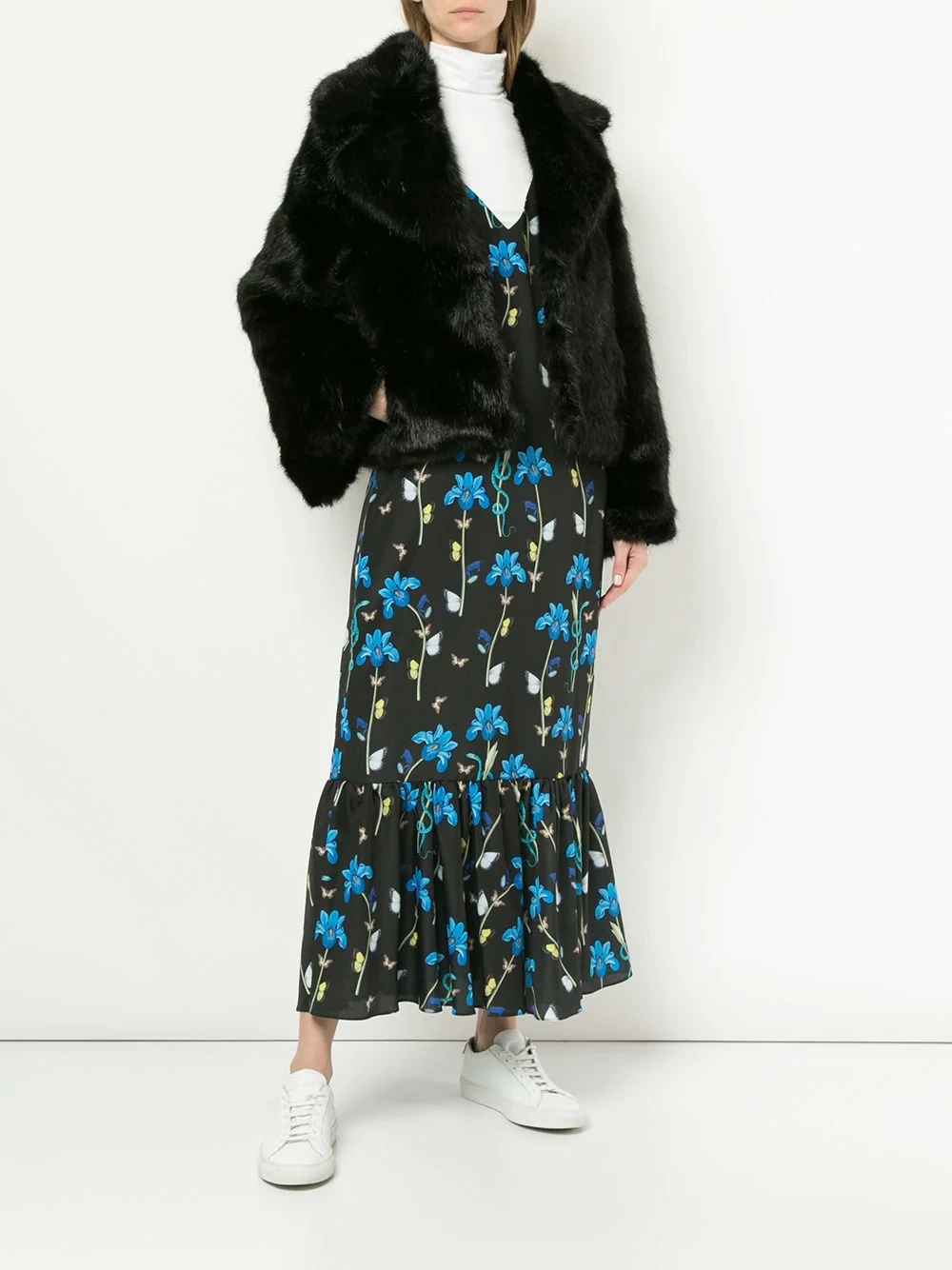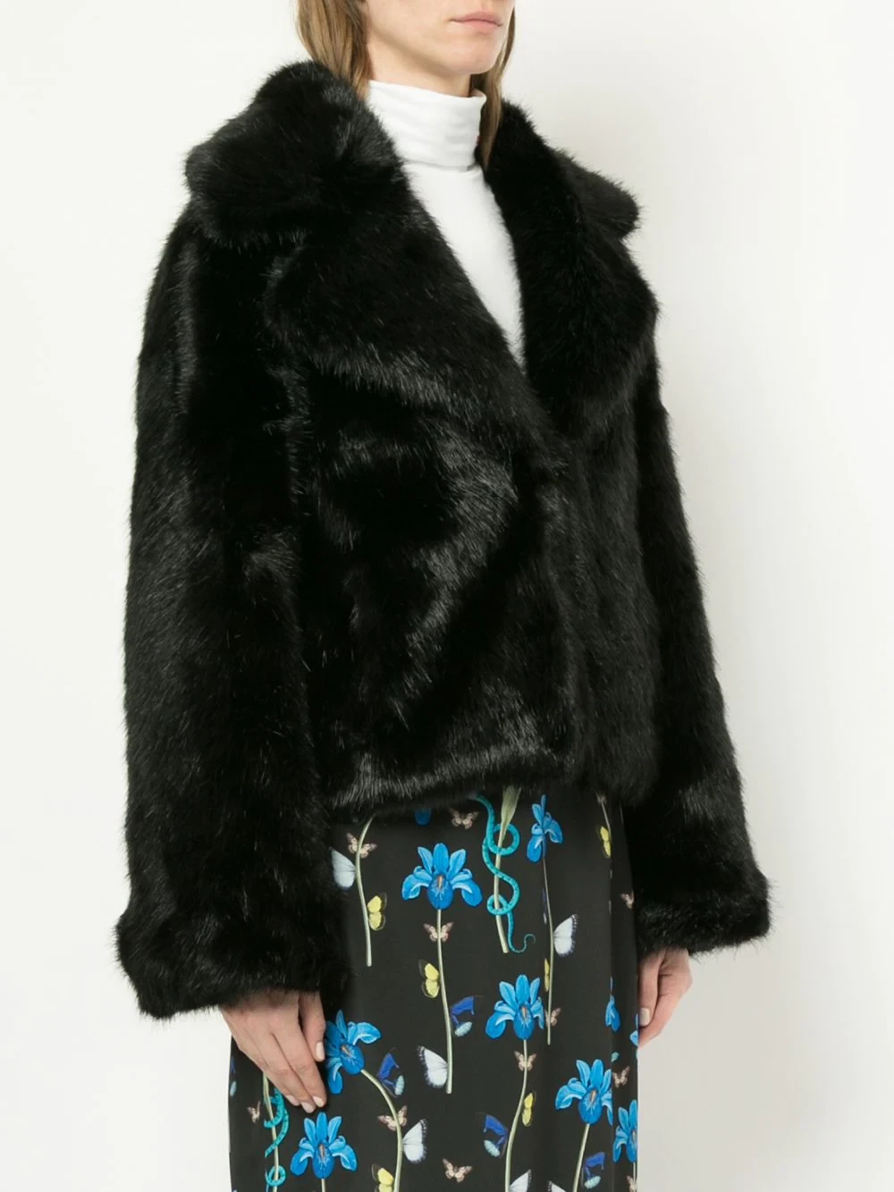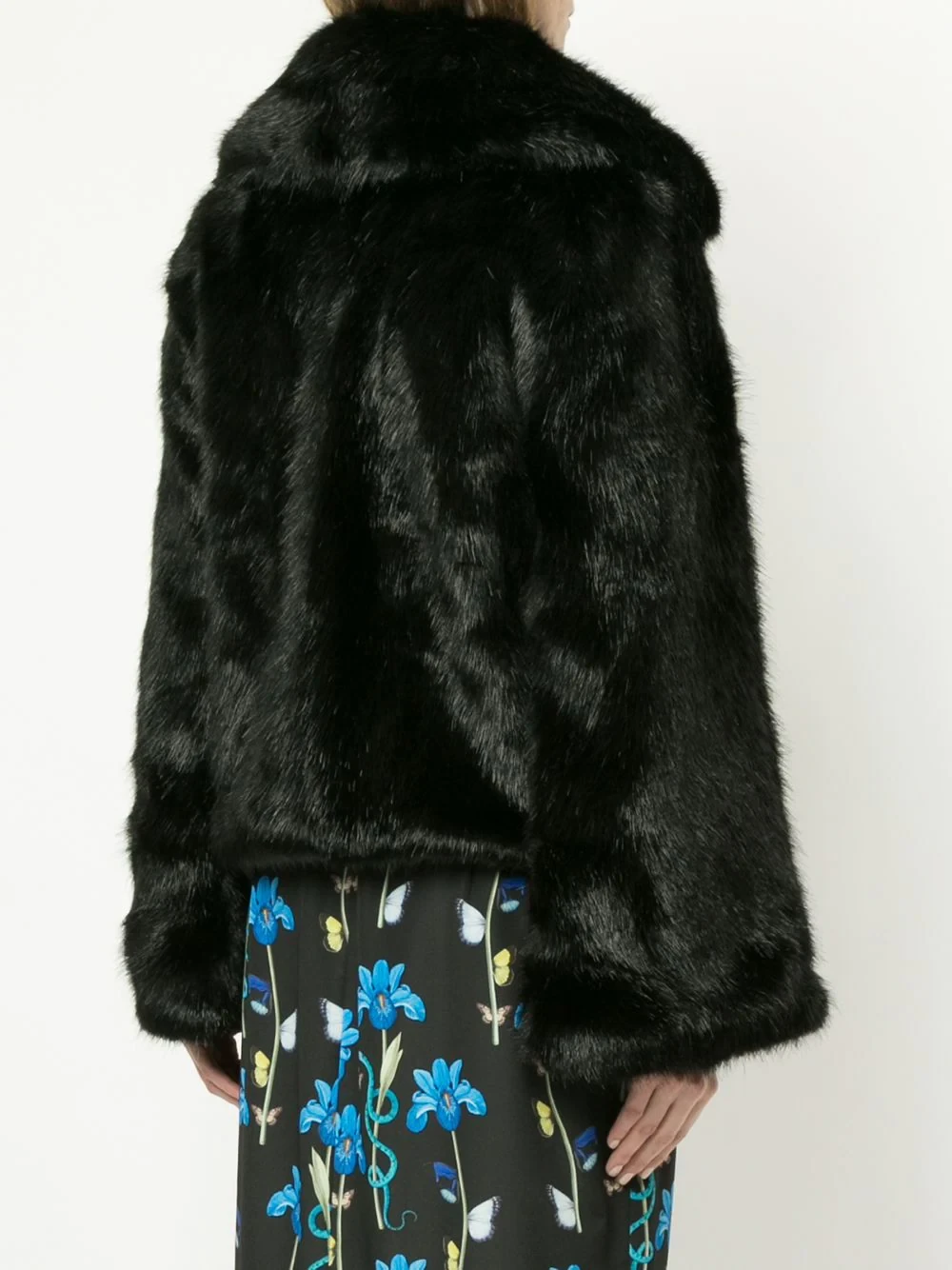 Black Madam Butterfly jacket from unreal fur featuring a wide lapel, a concealed front fastening, side slit pockets and a faux fur trim.