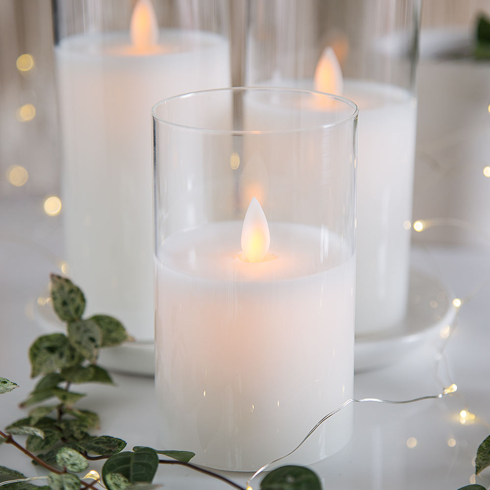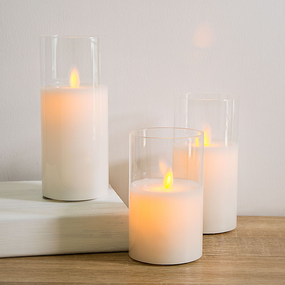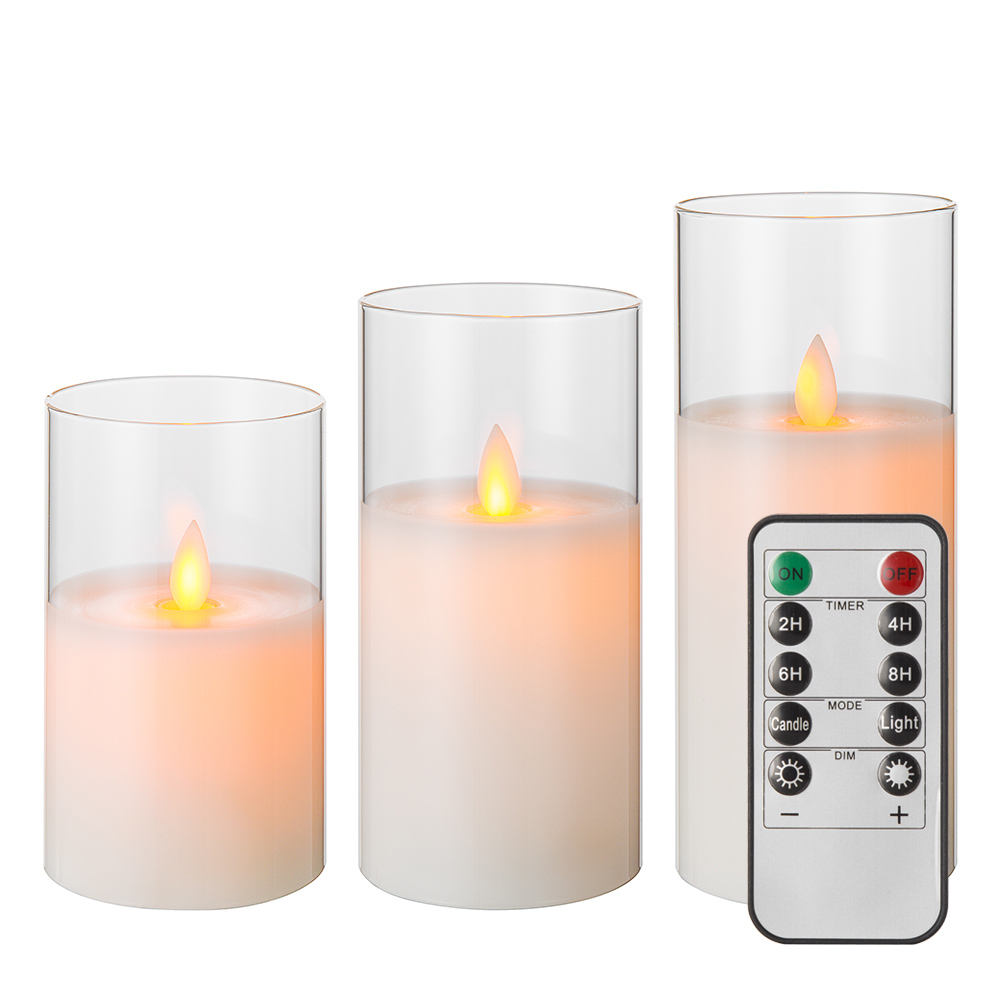 Essential details Place of Origin: Jiangsu, China Brand Name: Matti Model Number: WA0027 Material: Paraffin Wax, Glass Shape: PILLAR Use: Weddings, Home Decoration Occasion: Thanksgiving, Wedding Handmade: Yes Item name: battery operated flameless glass led candle Function: 6 key remote control Packing: Polystyrene Foam Mail Box MOQ: 10 Pcs Application: Wedding Birthday Party Gift Christmas Battery: 2*AA Certificate: CE ROHS Logo: Customized Logo Size: D7.5CMXH10/12.5/15CM