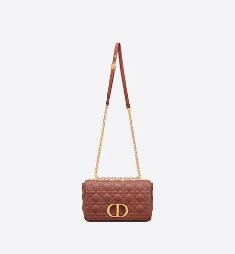 The Dior Caro bag combines modernity with timeless elegance. The design is crafted in rust-colored calfskin with Cannage stitching. The supple bag features a flap adorned with an antique gold-finish metal 'CD' twist clasp, inspired by the seal of a Christian Dior perfume bottle. The detachable chain strap with 'CD' signature links allows it to be carried by hand, worn over the shoulder or crossbody. It may be replaced by one of the House's wide embroidered straps, allowing the medium bag to pair with day or evening attire.