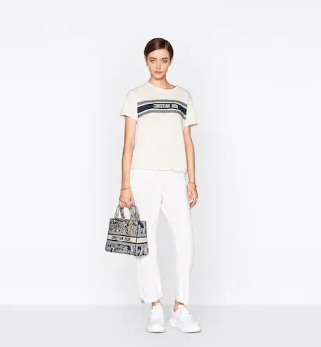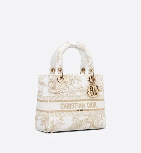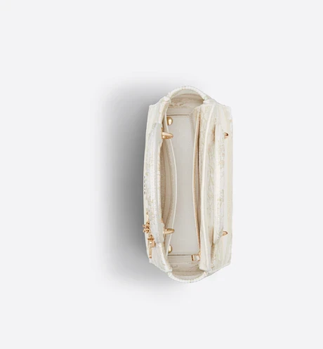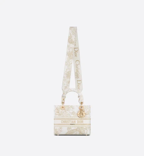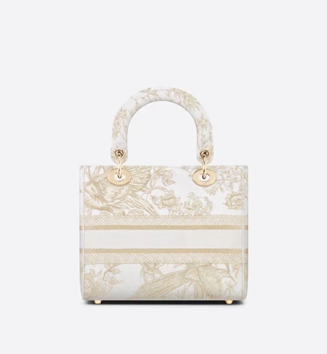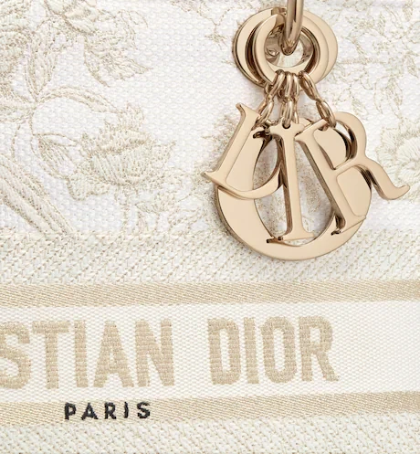 The Lady D-Lite bag combines classic elegance with House modernity. Fully embroidered with a Dior Jardin d'Hiver motif in gold-tone metallic thread, the creation offers a poetic and exotic interpretation of Mr. Dior's wall tapestries. The front features a 'CHRISTIAN DIOR PARIS' signature while 'D.I.O.R.' charms in pale gold-finish metal further enhance the silhouette. Equipped with a wide, reversible and removable embroidered shoulder strap, the medium Lady D-Lite bag can be carried by hand or worn crossbody.