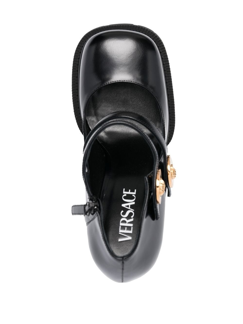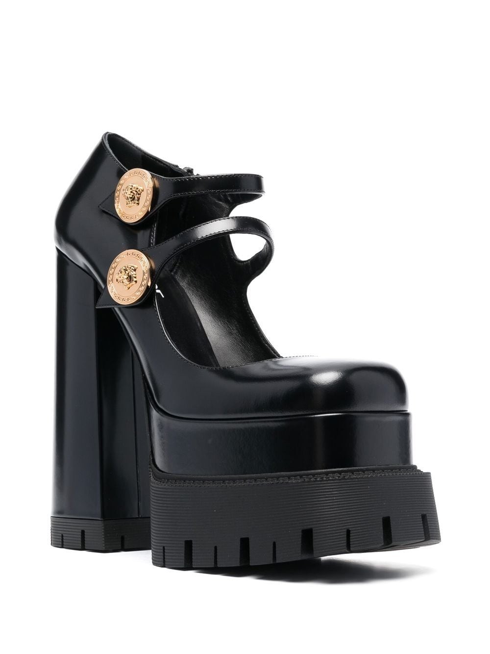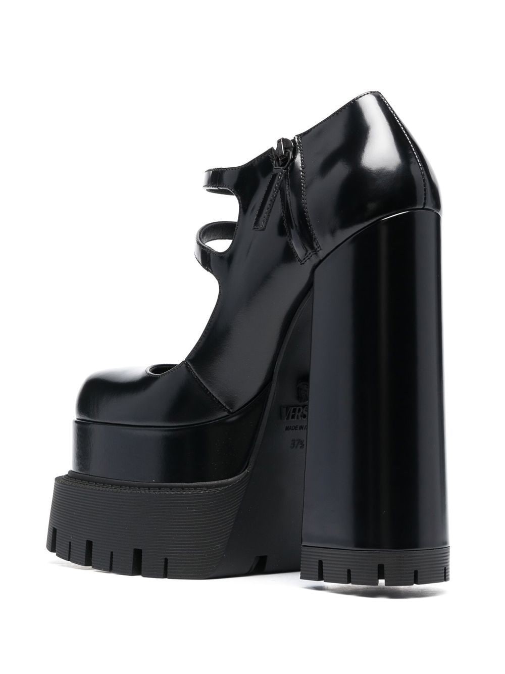 Having boldness in mind, Versace elevates these leather pumps with a daring 170mm block heel. The look is completed with a 70mm platform sole where the ridged design takes focus.