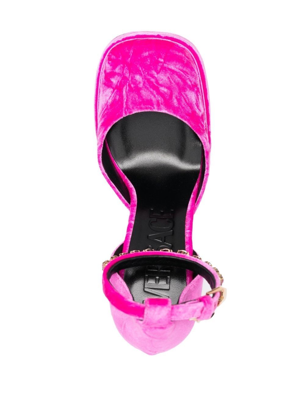The Versace Medusa Aevitas pumps are a statement piece, presented here in a bright pink velvet finish. Set on a double platform with a towering 155mm block heel, the pair is finished with the iconic Medusa charm and a row of rhinestones.