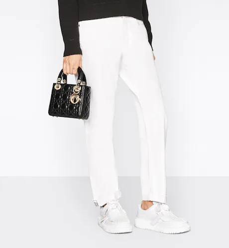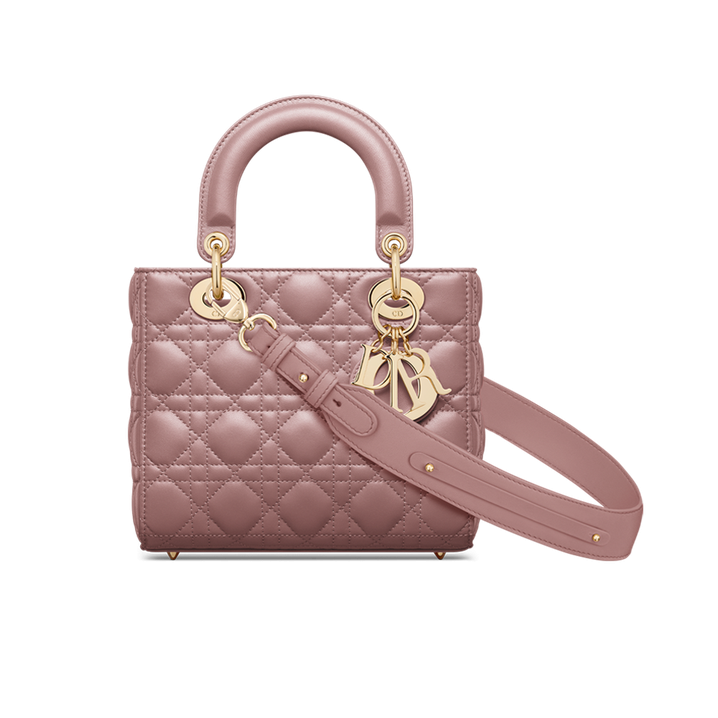 The Lady Dior handbag epitomizes the House's vision of elegance and beauty. Sleek and refined, the style is timeless. It is crafted in peony pink patent calfskin with Cannage stitching, creating the instantly recognizable quilted texture. The pale gold-finish metal signature 'D.I.O.R.' charms embellish and illuminate its silhouette. Featuring a removable chain strap, the miniature Lady Dior bag can be carried by hand or worn crossbody as an ideal evening companion.