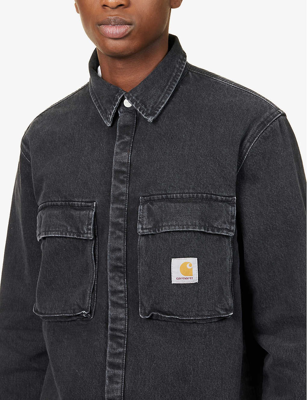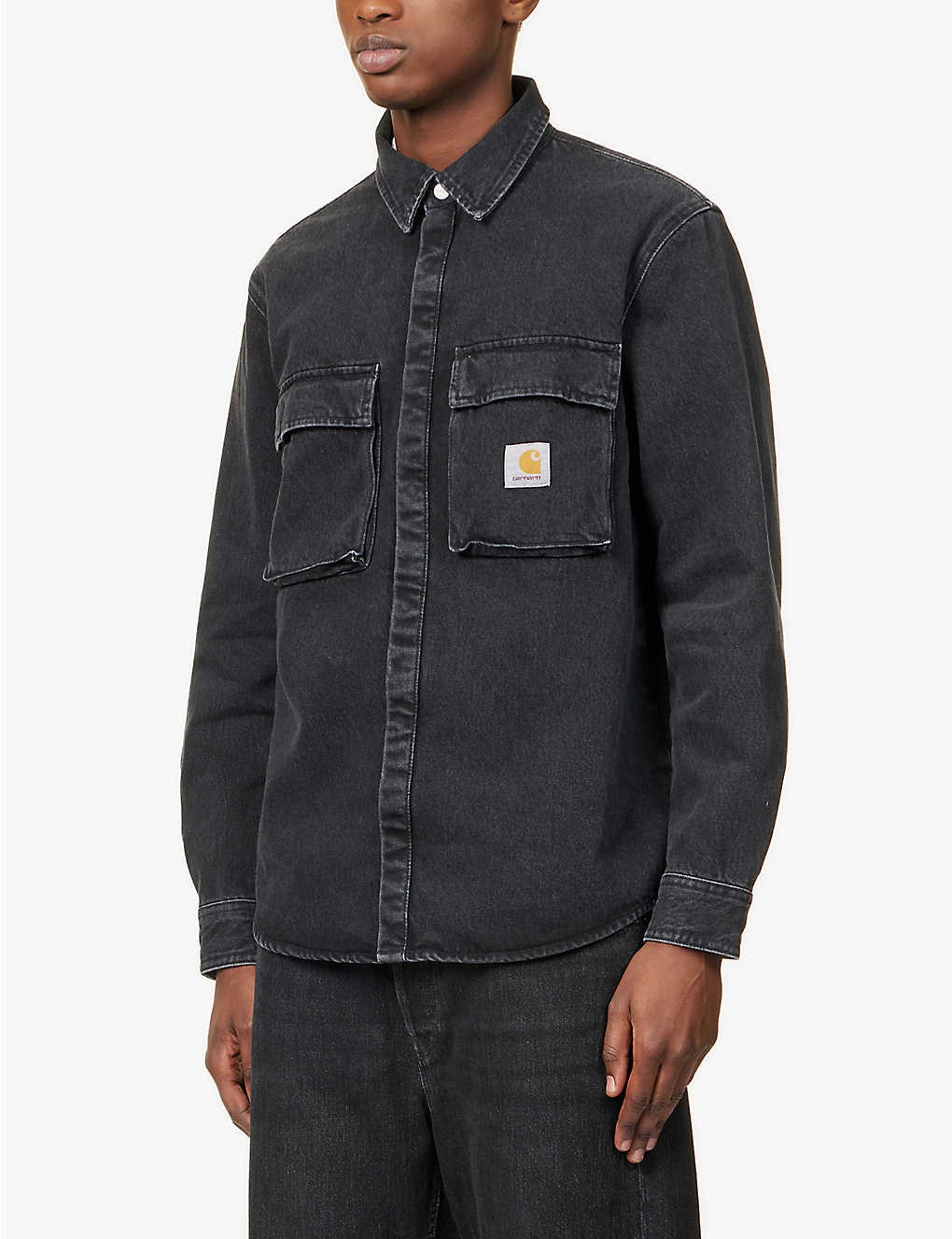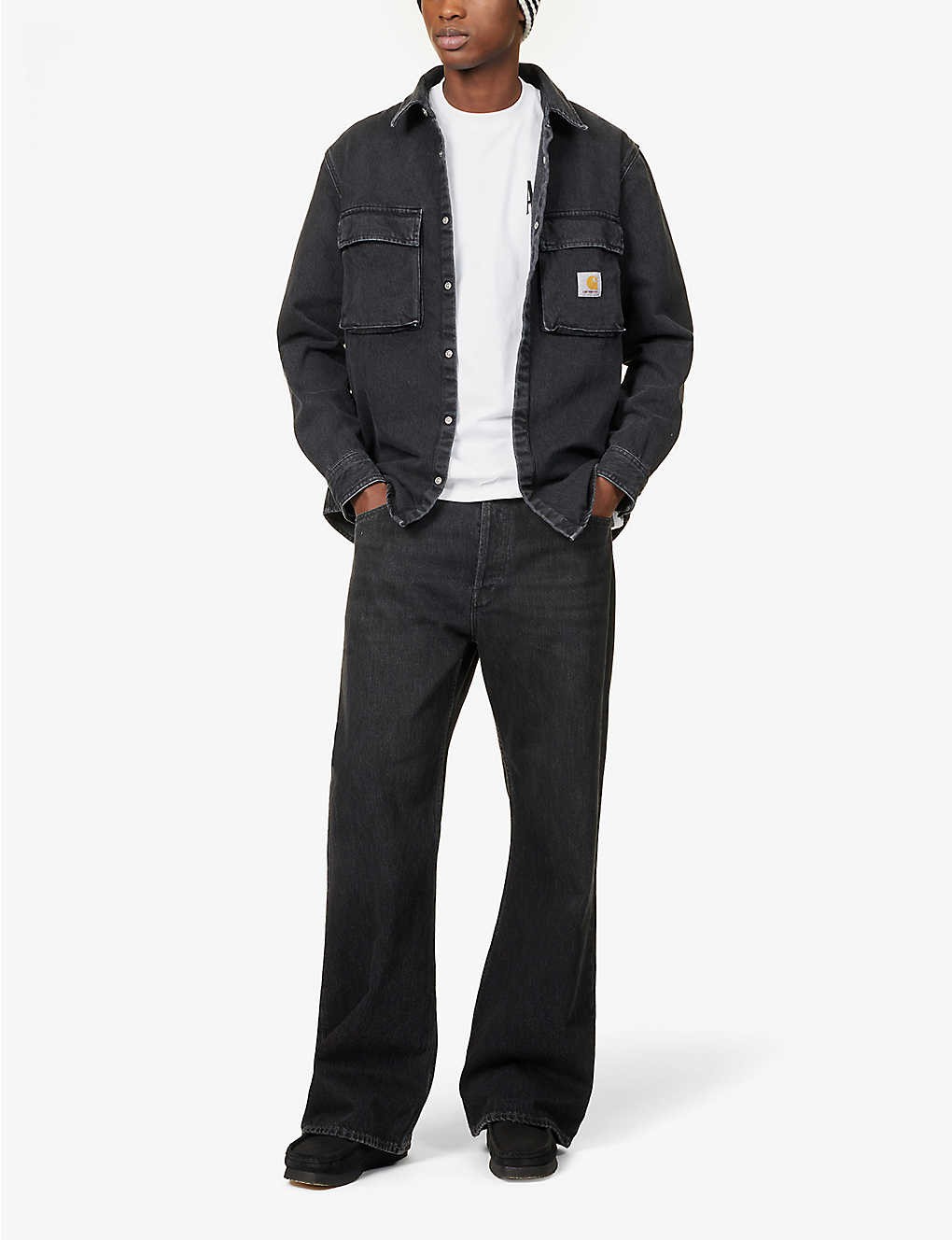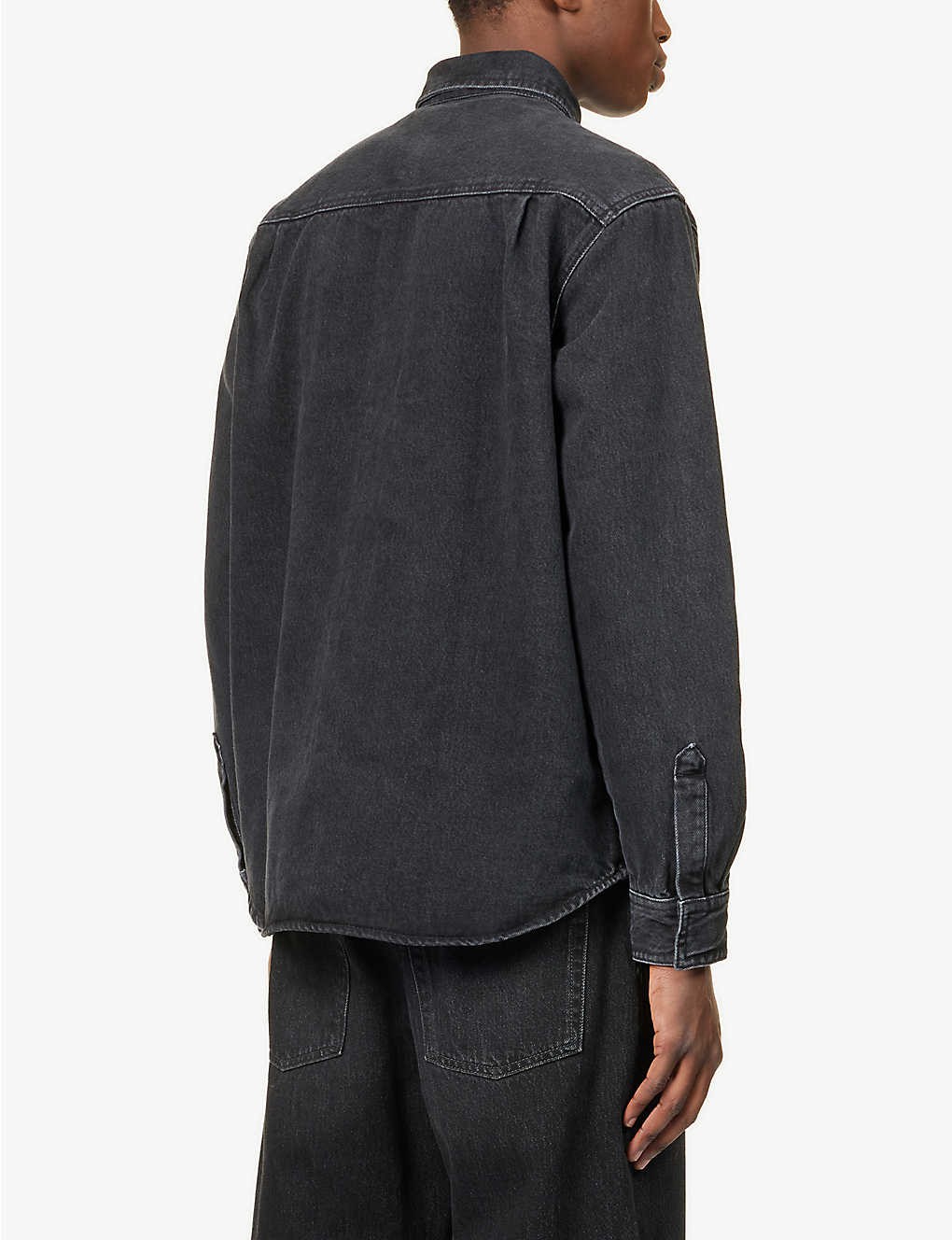 Relaxed fit, straight-point collar, long sleeves, buttoned cuffs, branded hardware, two flap pockets at chest, branded patch at chest, pleated yoke, faded wash, curved hem