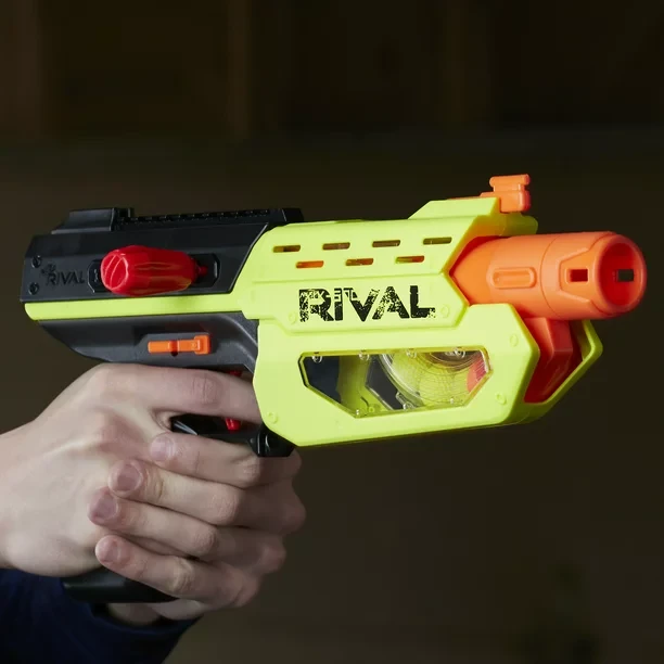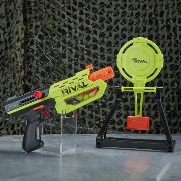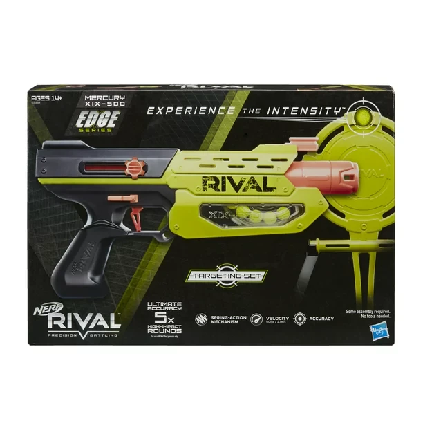 Nerf Rival competitors can practice their skills with this Edge Series blaster and targeting set. The Mercury XIX-500 blaster comes with a reactive target that swings when hit, so battlers can check their precision with every shot. This bolt-action blaster comes with 5 Official Nerf Rival rounds. To fire, insert 5 rounds, prime, check the ready indicator, and pull the trigger to fire 1 round at a velocity of 90 feet per second (27 meters per second). A trigger lock prevents it from firing accidentally. Attach the bolt to either side to customize for right- or left-handed players. With the Mercury XIX-500 blaster and targeting set, Nerf Rival battlers can build their skills and edge out their competitors in Nerf Rival games Nerf and all related properties are trademarks of Hasbro. For use with Nerf Rival products only. Some assembly required. No tools needed.