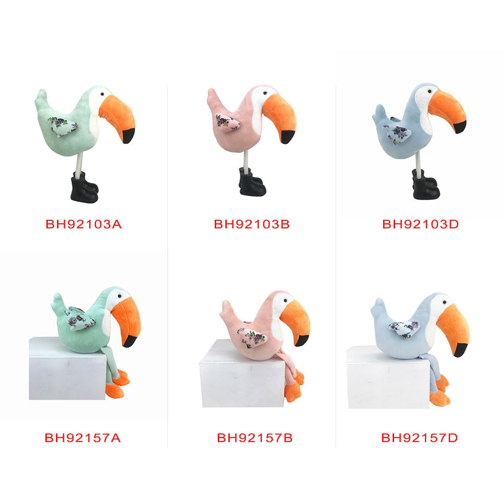 Essential details Type: Other Home Decor Design Style: Minimalist, Contemporary, Traditional, Transitional, Rustic, Shabby Chic, Coastal, Scandinavian, Bohemian, Mid-Century Modern, Industrial, Eclectic, Farmhouse, Country, Art Decor, Asian Zen, Tropical, Vintage, Novelty, Moroccan, Casual, Oriental, Children's, Craftsman, Southwestern, CLASSIC, Modern, Glam, Morden Luxury Place of Origin: Fujian, China Brand Name: Boheng or OEM Model Number: BH92157B Material: Fabric, velvet, polyester filling Fabric Type: 100% Polyester Product name: new development toucan bird home decor Size: 28*13*36cm or custom size Usage: home decoration animals,toy Color: Sample color or custom color Logo: Custom logo ,embroidery or printing Description: dangle legs shelf sitter big mouth bird hornbill Sample: Availiable Style: new fashion velvet fabric crafts Keywords: Unique taco toucan bird Commercial Buyer: Caterers
