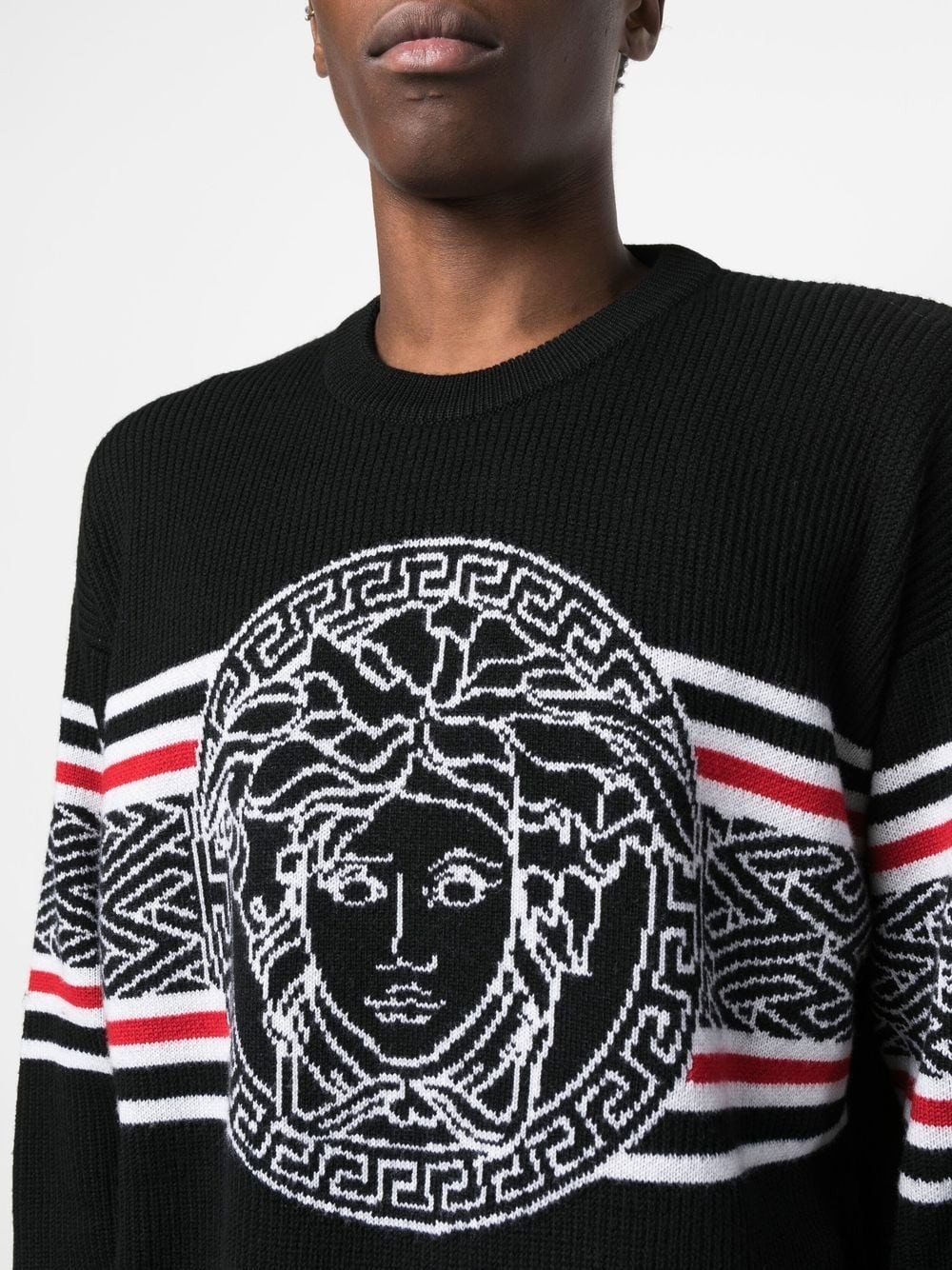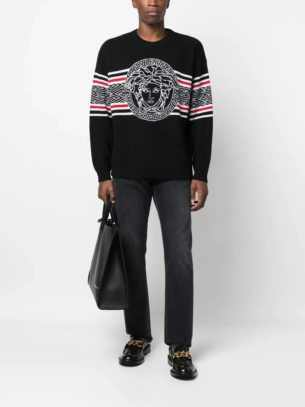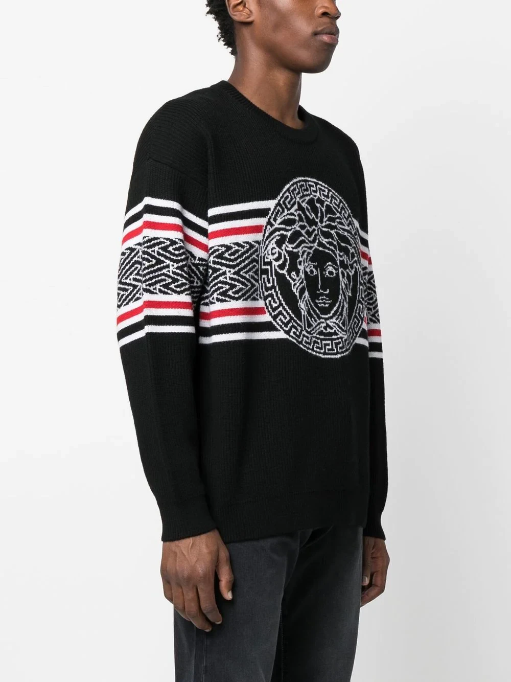 Versace incorporates iconic motifs of the label into this jumper. Crafted from virgin wool, the crew-neck silhouette depicts the brand's signature Medusa Head graphic.