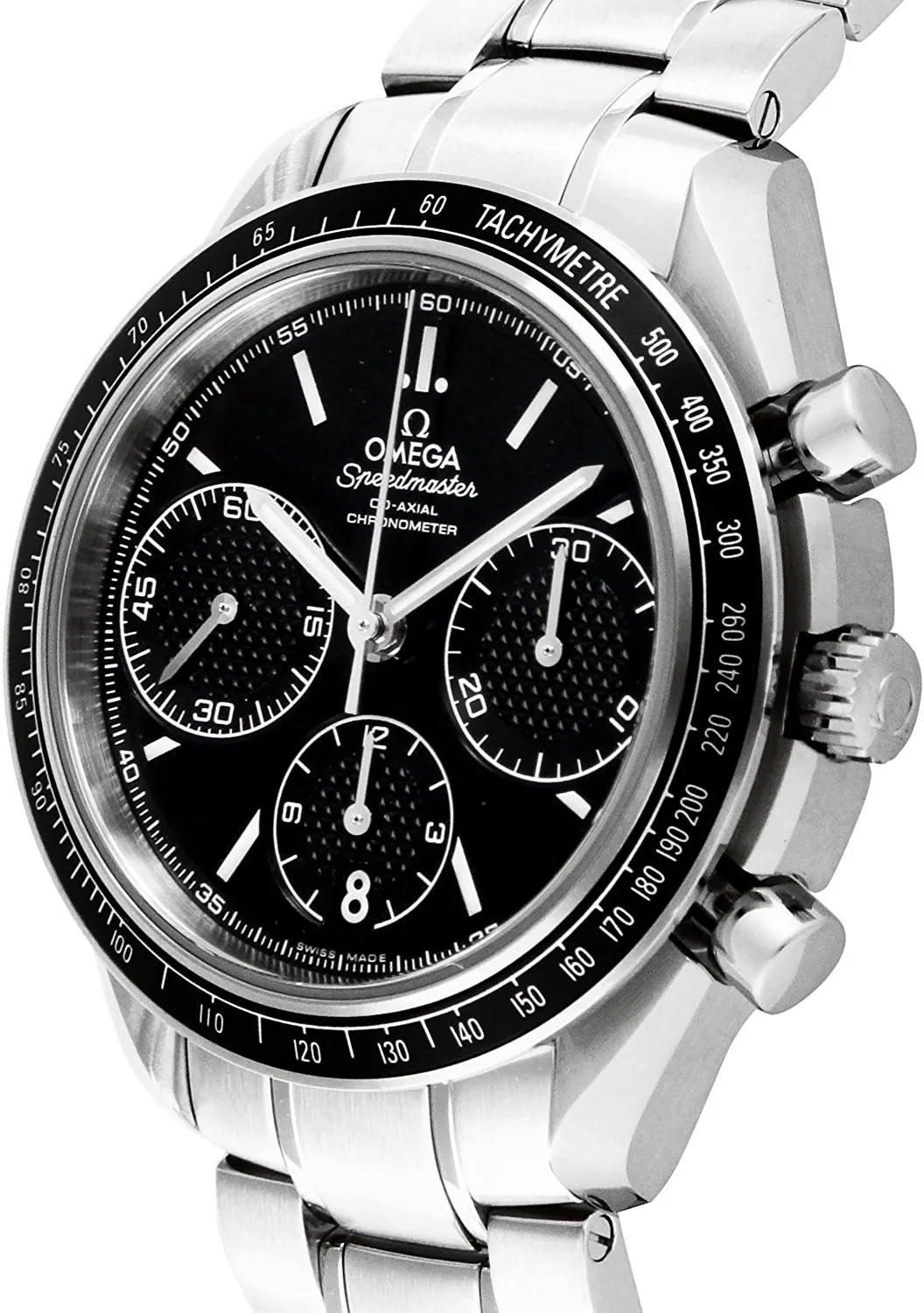 Black dial. Silver-tone stainless steel case with a silver-tone stainless steel band. Automatic movement. 100 meters / 330 feet water resistance. Fixed Tachymeter Scale bezel. Deployment with Push Button Release clasp. Case size 40 mm x 15 mm. Omega 326.30.40.50.01.001 Speedmaster Racing Watch.