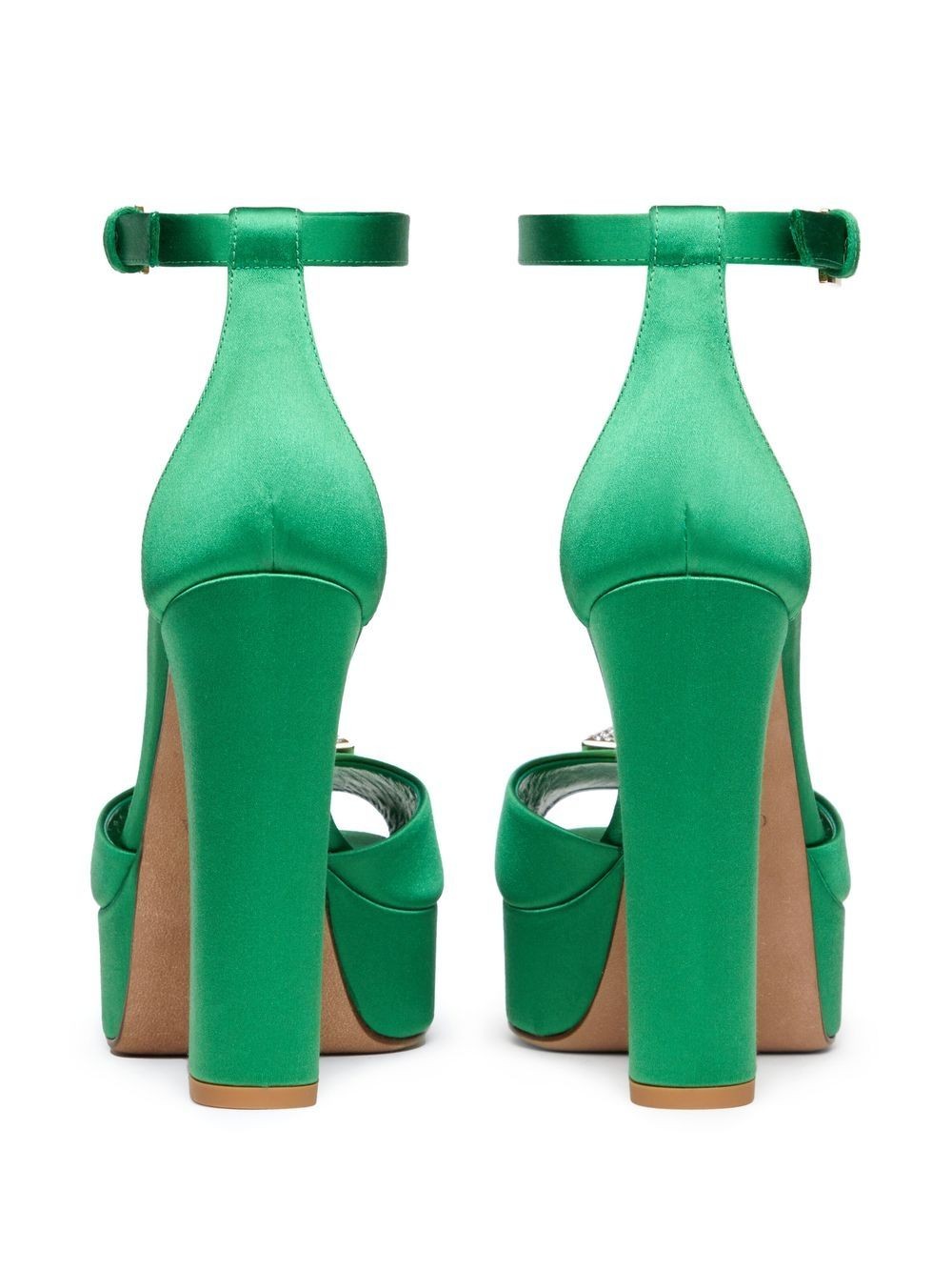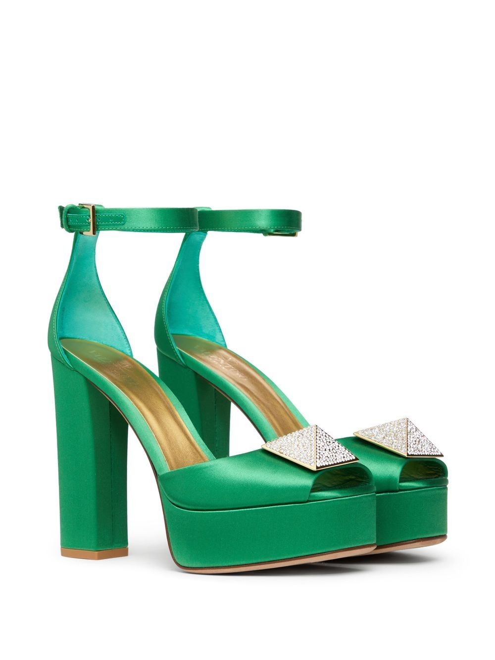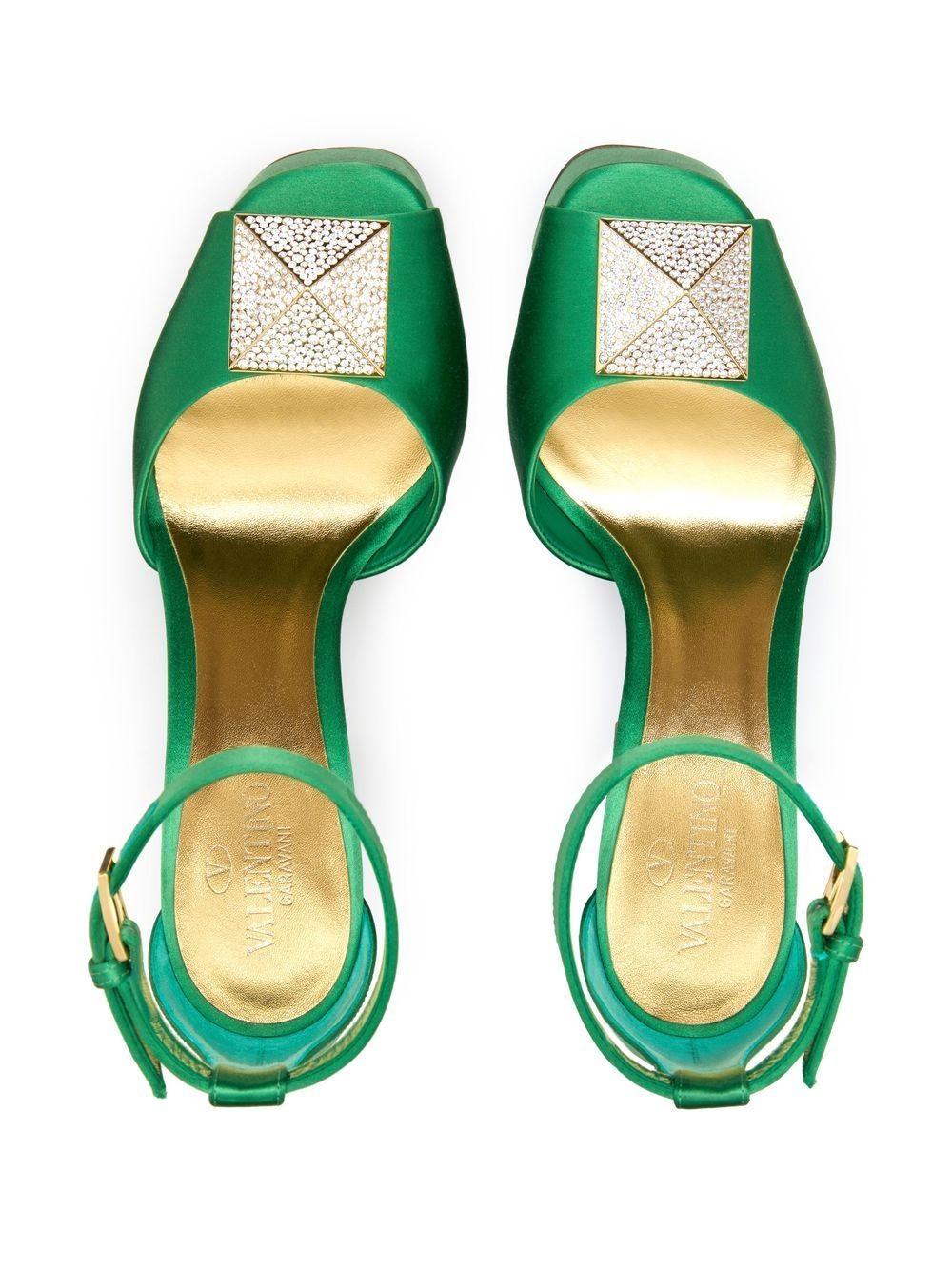 Prepare to turn heads in these emerald green platform sandals from Valentino Garavani. The crystal-embellished One Stud, a bigger version of the house's signature Rockstud motif, adorns this eccentric design.