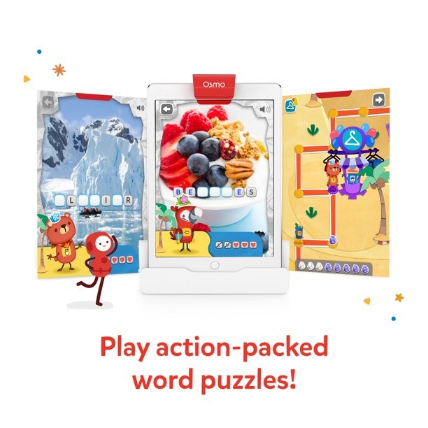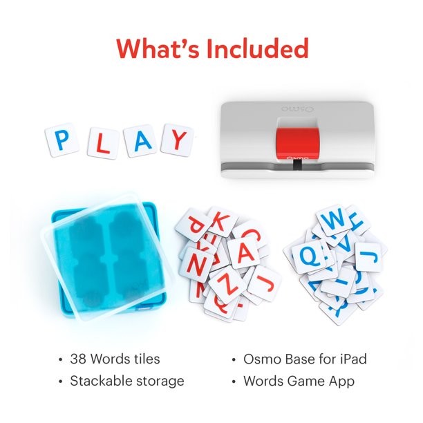 Words tiles, stackable storage, Osmo Base for iPad, and three games. iPad is not included and is required to play.
