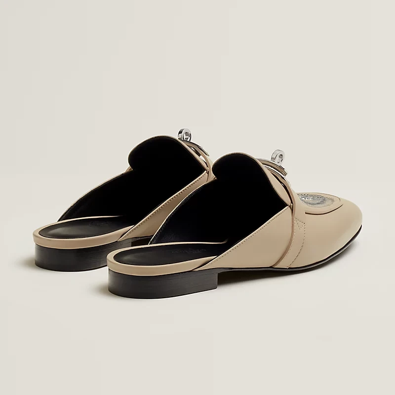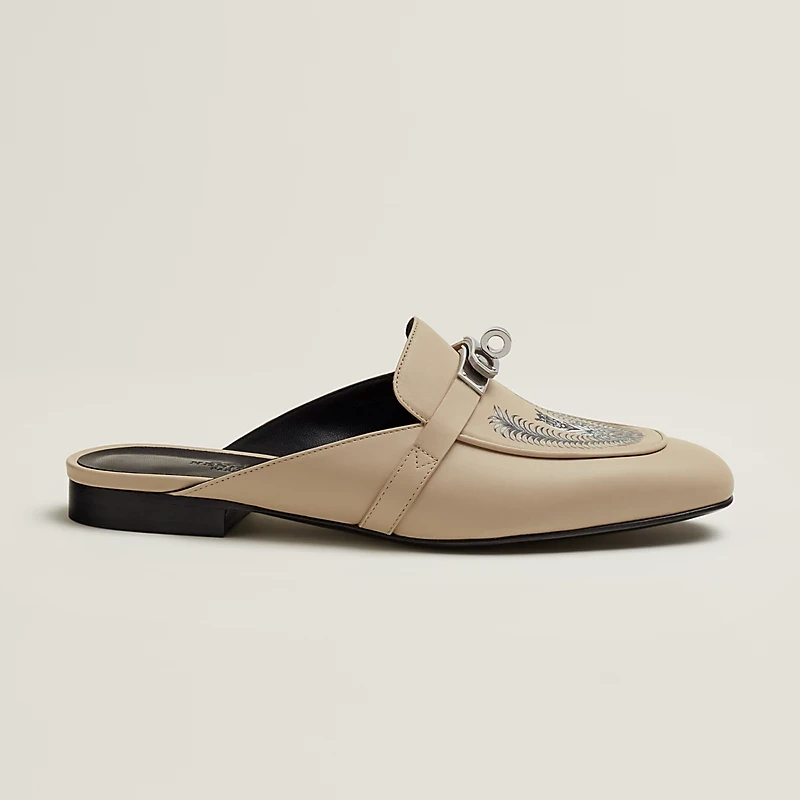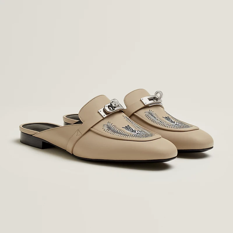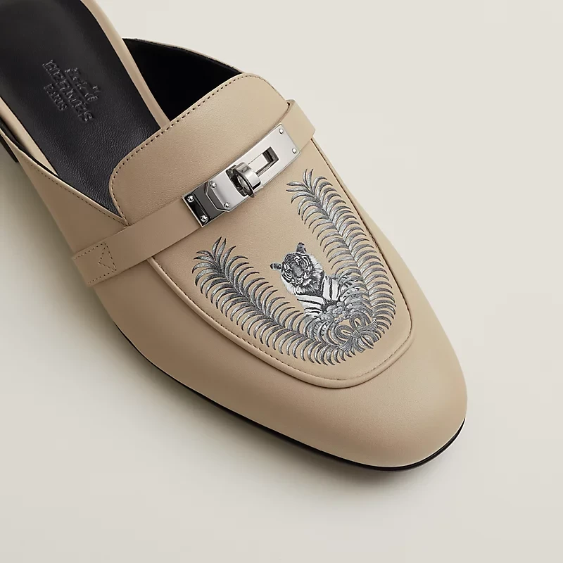 Mule in calfskin with "Tigre Royal" print and iconic palladium-plated Kelly buckle.