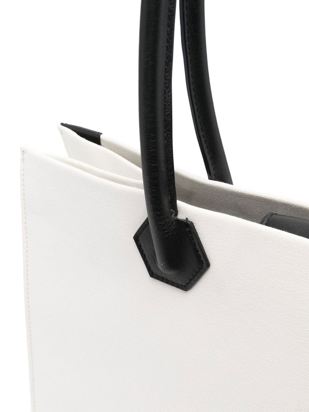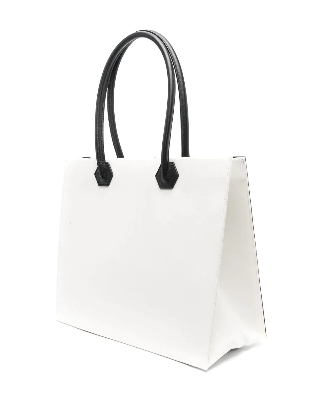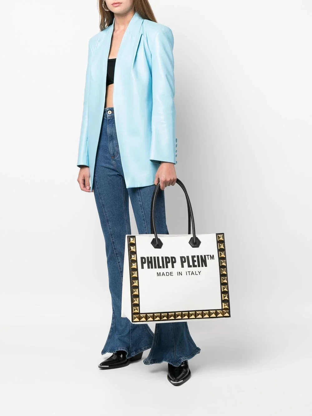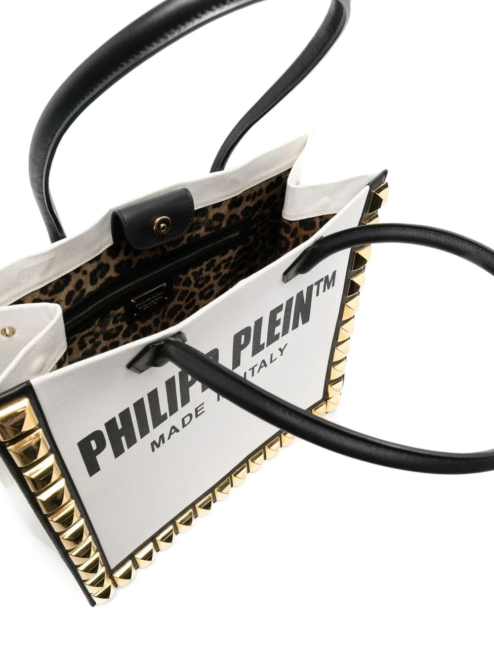 logo-print studded tote bag from PHILIPP PLEIN featuring white, leather, logo print to the front, two top handles, studded trim, gold-tone hardware, press-stud fastening, internal zip-fastening pocket and main compartment.