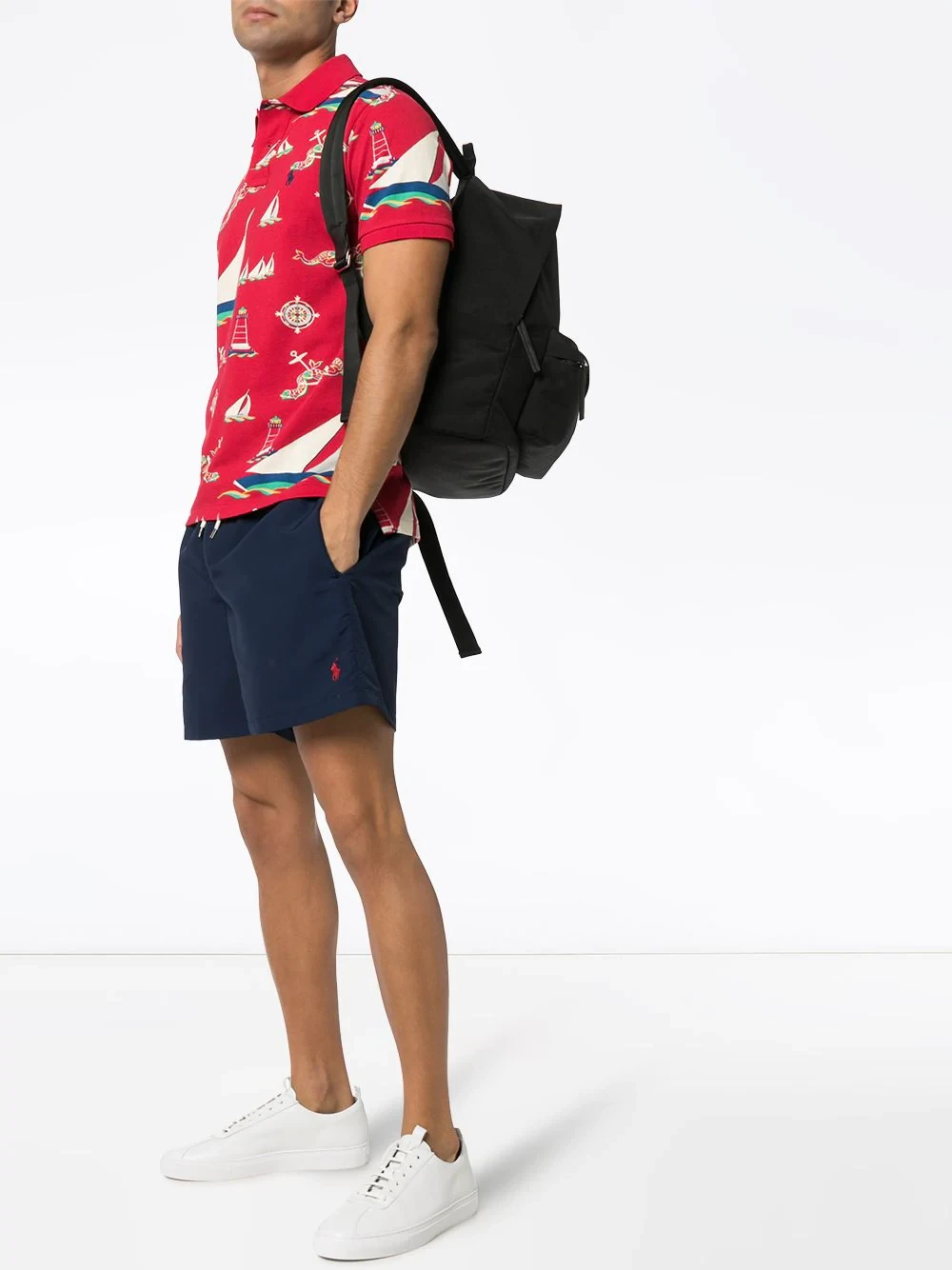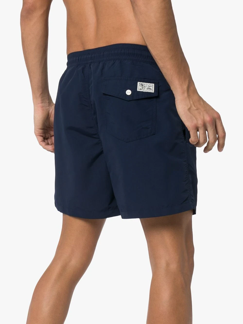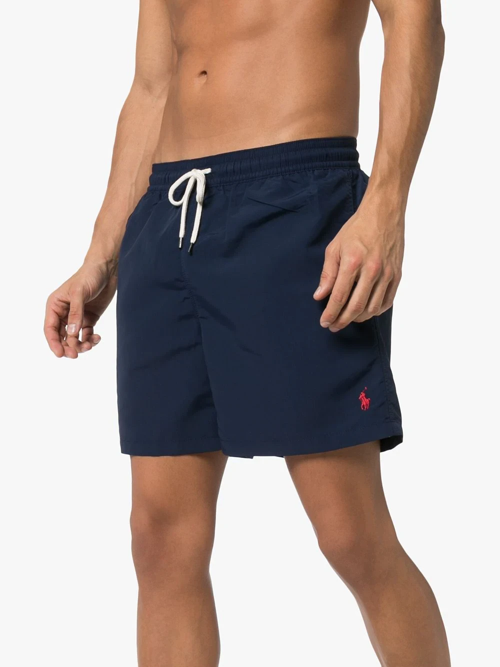 Take the plunge in these navy blue logo embroidered swim shorts from Polo Ralph Lauren. What are you waiting for? Make a splash. Featuring an elasticated drawstring waist, side slit pockets, a short length and an embroidered logo to the front. Swimwear must be tried on over your own garments.