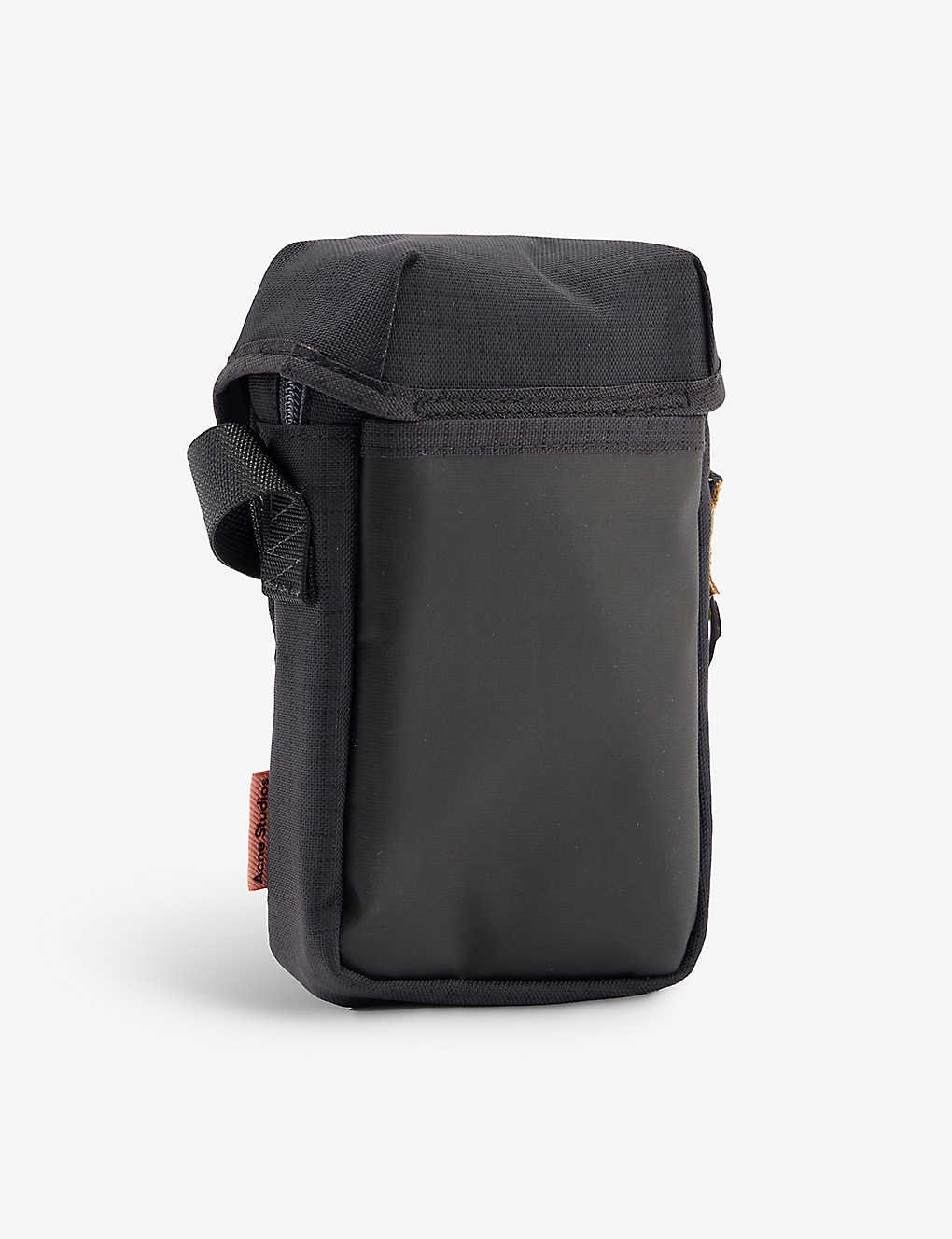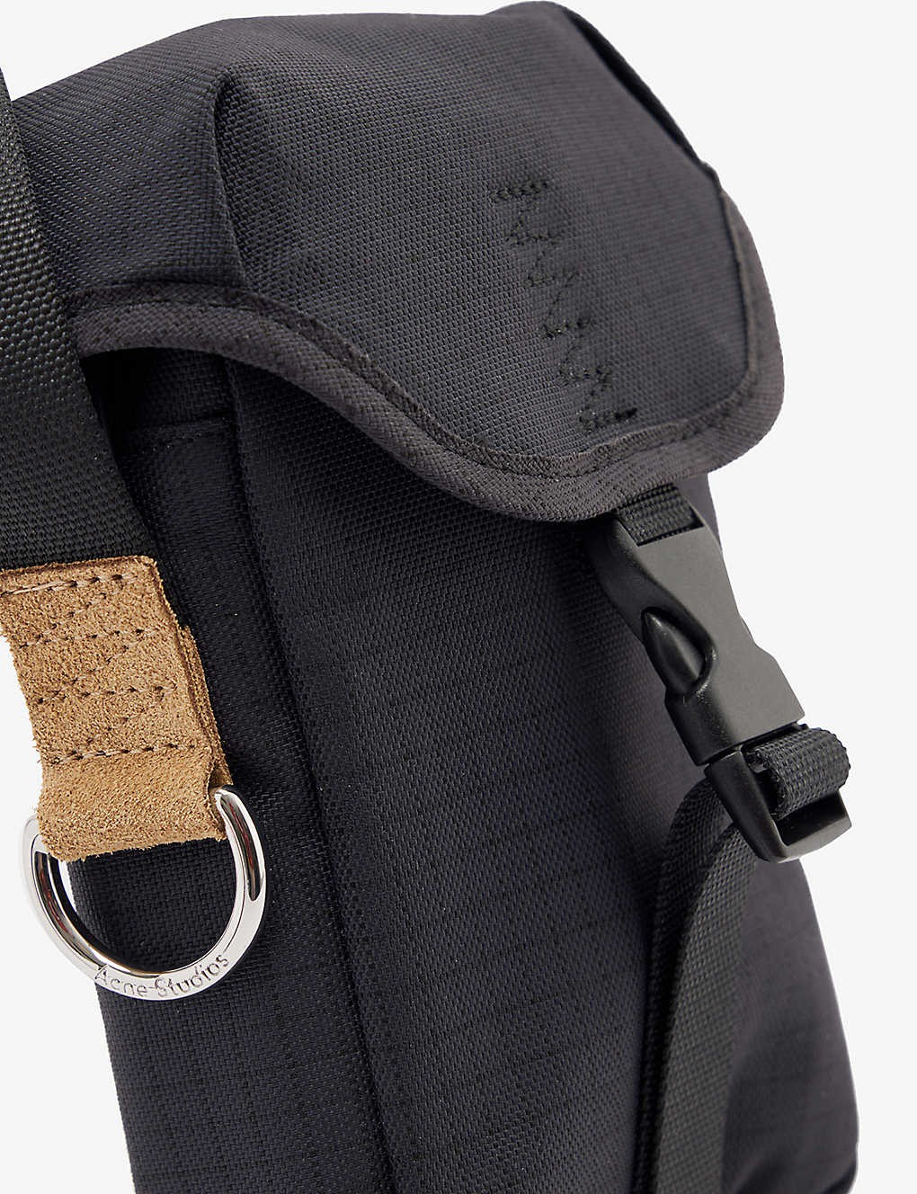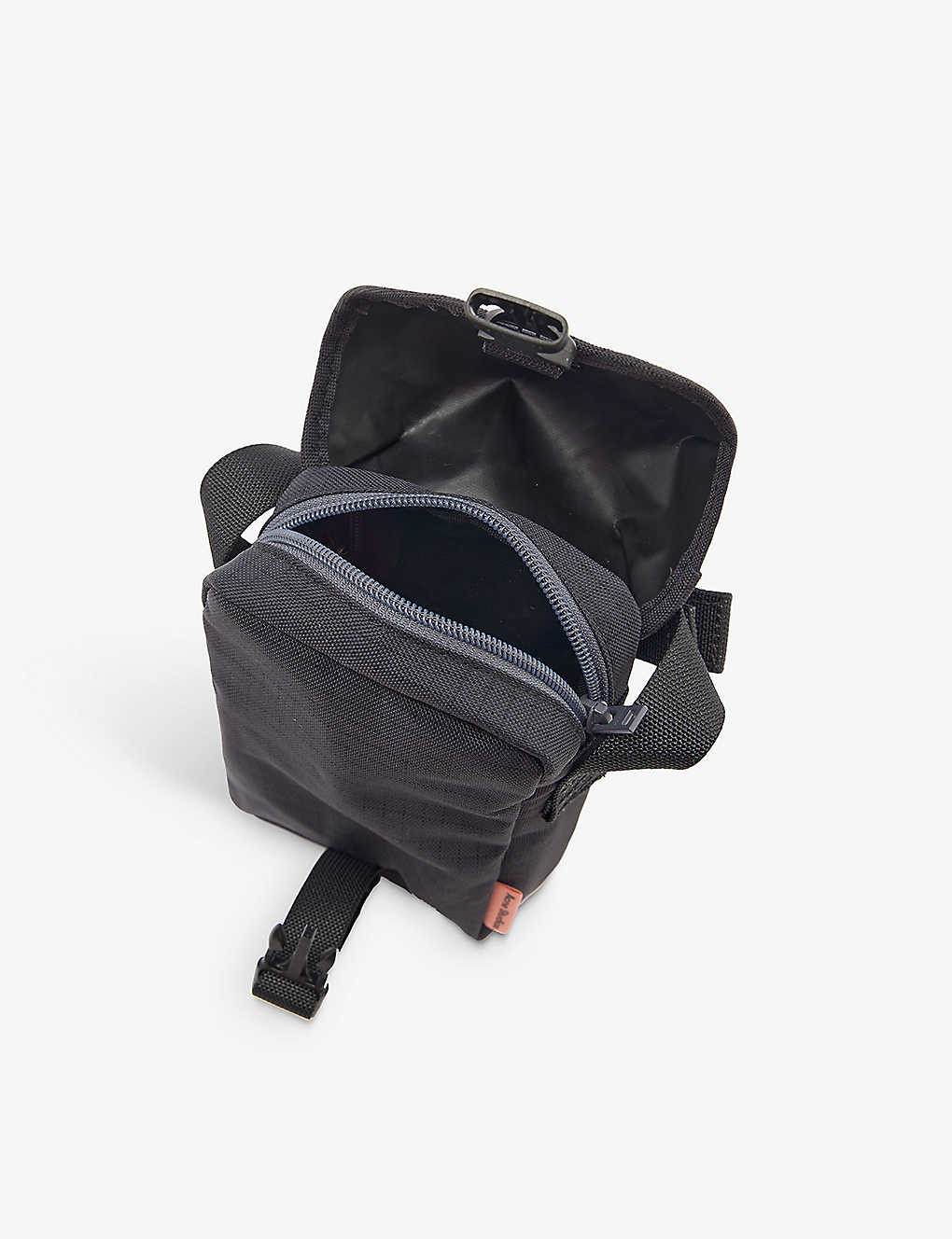 Embroidered brand tab at side, adjustable shoulder strap, flap closure with buckle-clip at front, one main compartment, silver-toned hardware