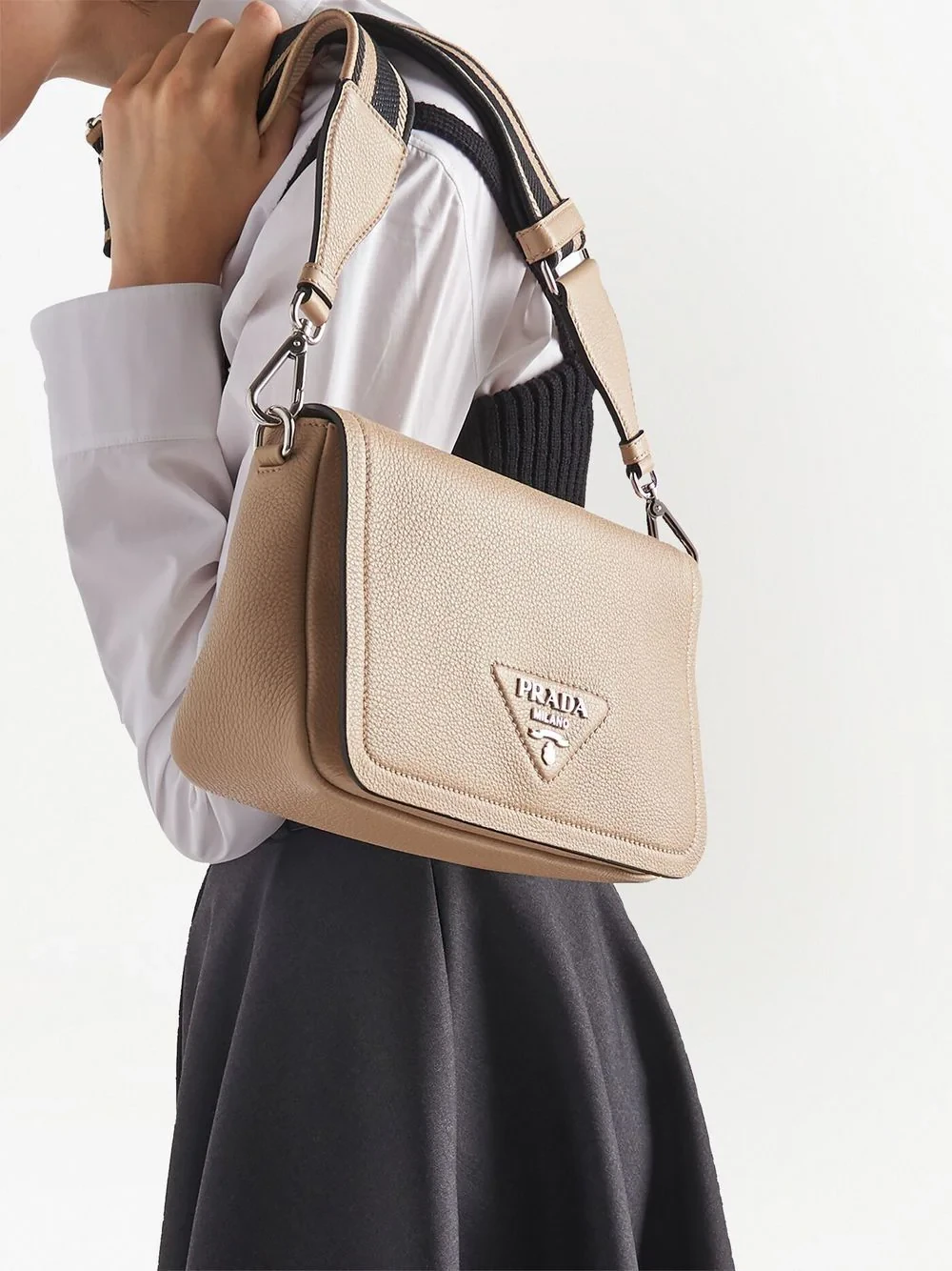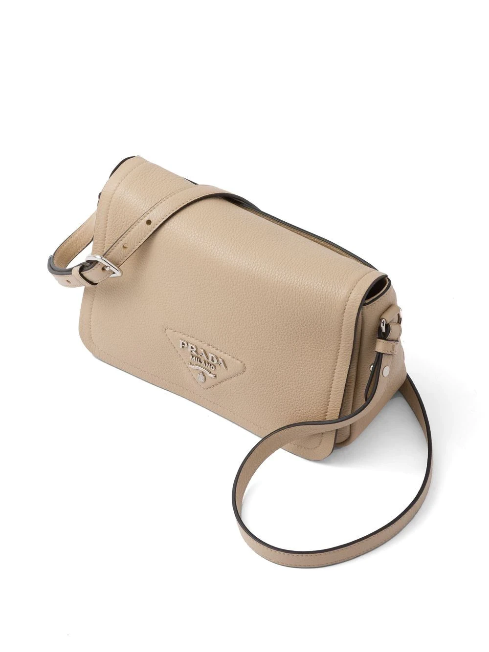 Prada's triangular logo plaque is an iconic motif for the brand that transcends seasons thanks to its traditional shape and refined lettering. Crafted from leather in a timeless beige tone, this modern silhouette is decorated with the silver-tone lettering logo on the flap and finished with an embroidered logo shoulder strap.