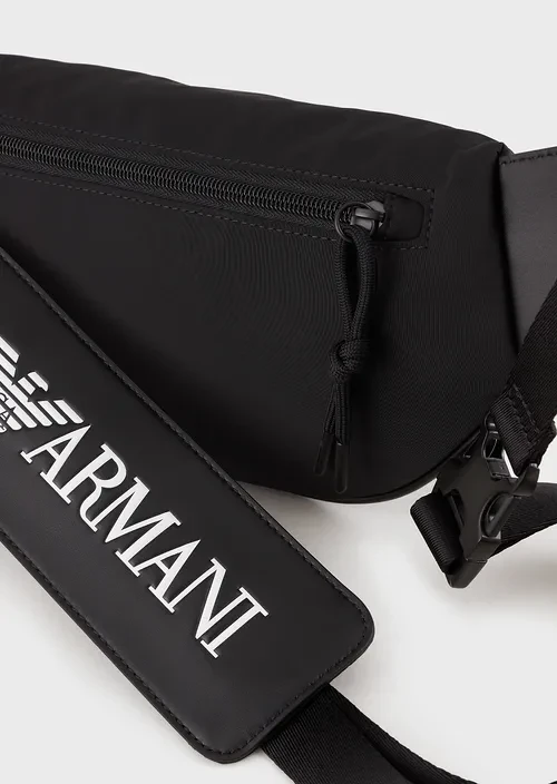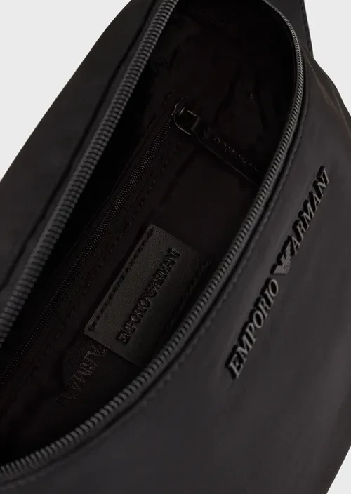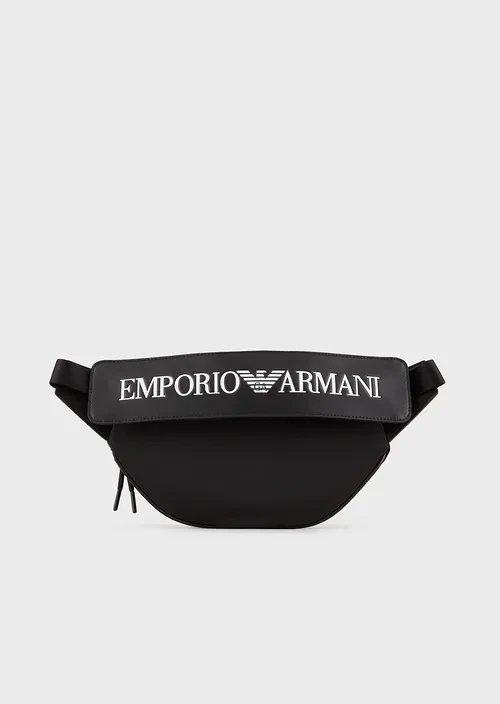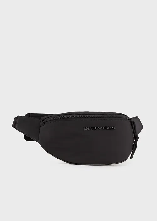Outdoor inspiration for this line of accessories made from recycled nylon with regenerated leather inserts. A clean image that takes on an athletic appeal, as underlined by the contrasting logo print on the shoulder strap. Belt bag with zip fastening. Dimensions: 26 x 15 x 7 cm.