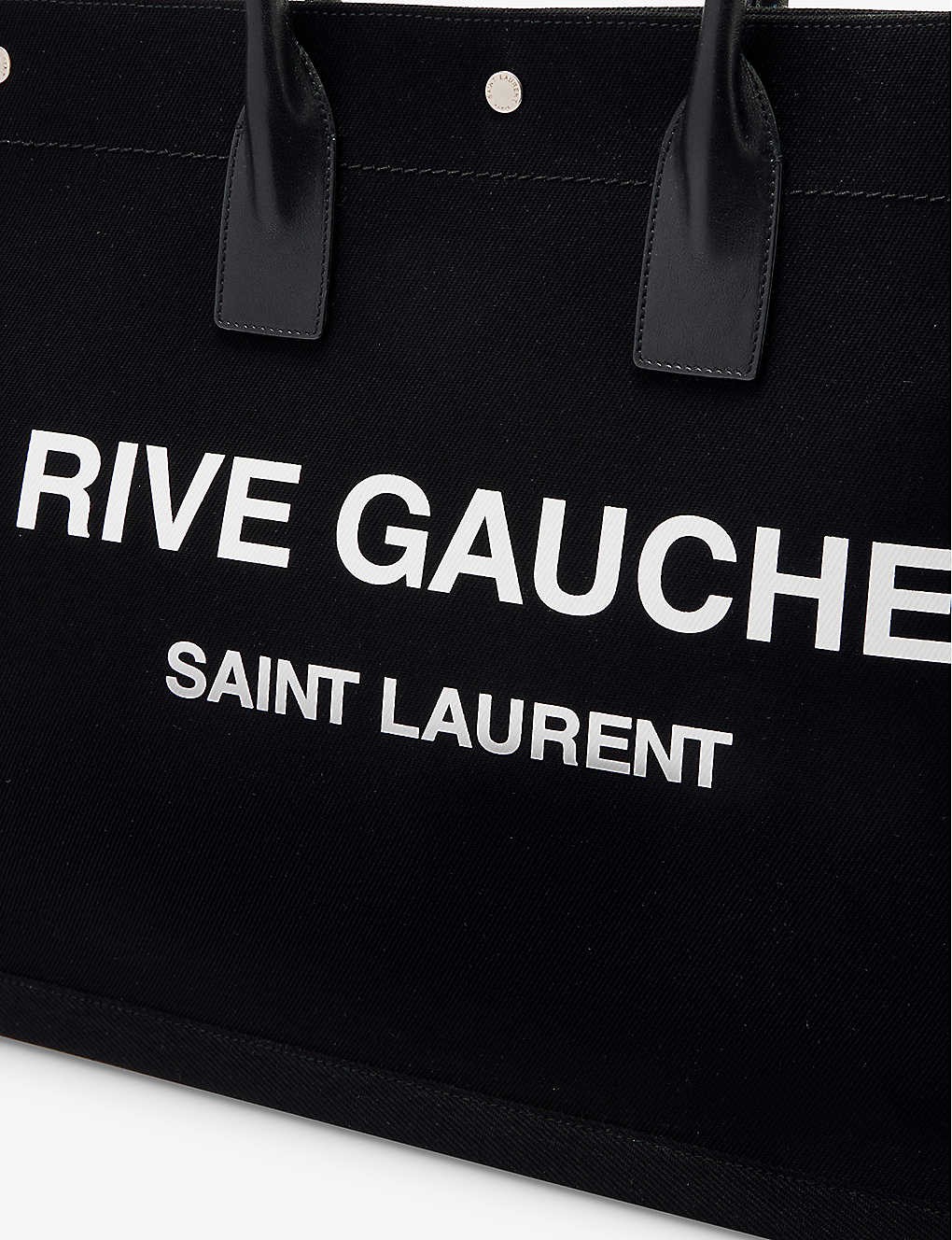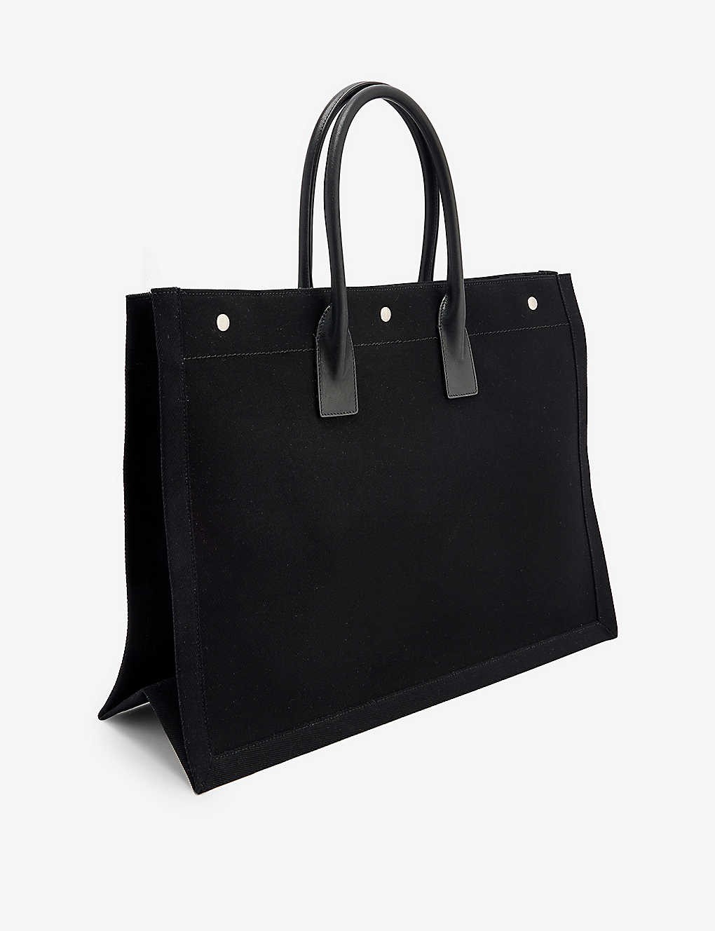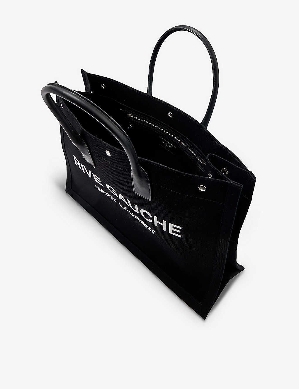Double top handles, structured shape, brand text print at front, internal zip pocket, branded silver-toned hardware, all-over canvas texture