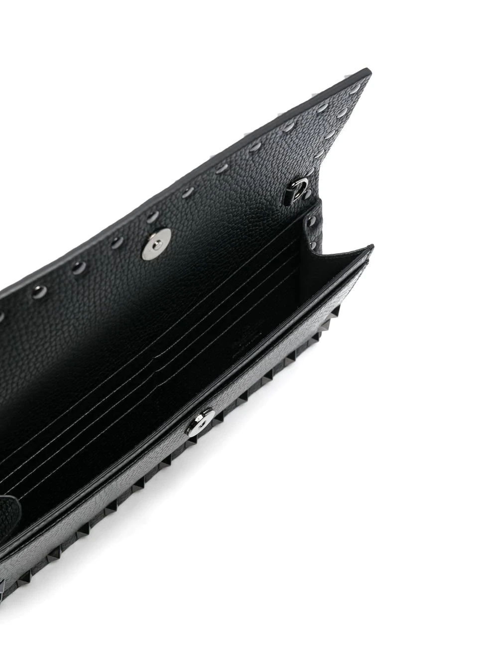 Rockstud cross-body bag from VALENTINO GARAVANI featuring black, calf leather, grained texture, logo stamp to the front, signature Rockstud embellishment, foldover top with magnetic fastening, detachable chain-link shoulder strap and internal card slots.