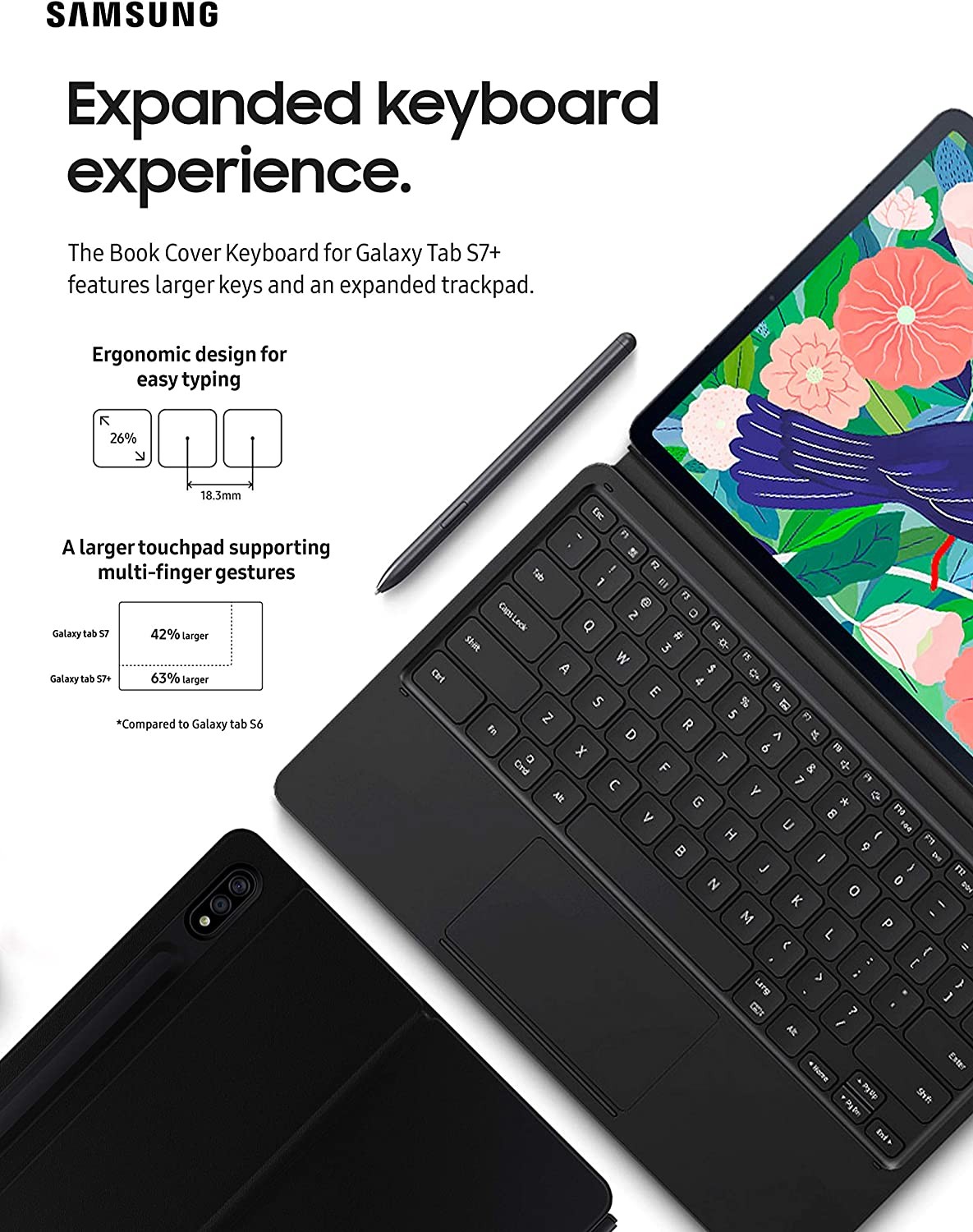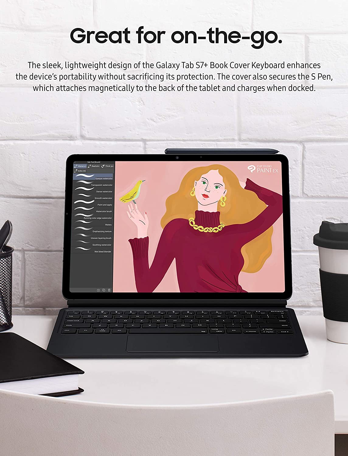 GREATER FOR ON-THE-GO: The sleek, lightweight design of the Galaxy Tab S7 plus Book Cover Keyboard enhances the device’s portability without sacrificing its protection. Grab your covered tablet on the way out the door and feel confident that both the screen and back of the tablet will be protected. The cover also secures the S Pen, which attaches magnetically to the back of the tablet and charges when docked.