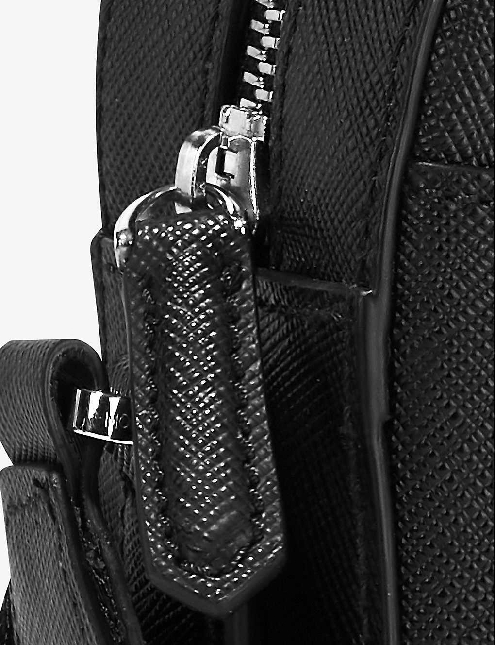 Chrome-tanned full-grain leather with saffiano print, palladium-coated brass branded pin, adjustable shoulder strap, one main compartment, one front open pocket