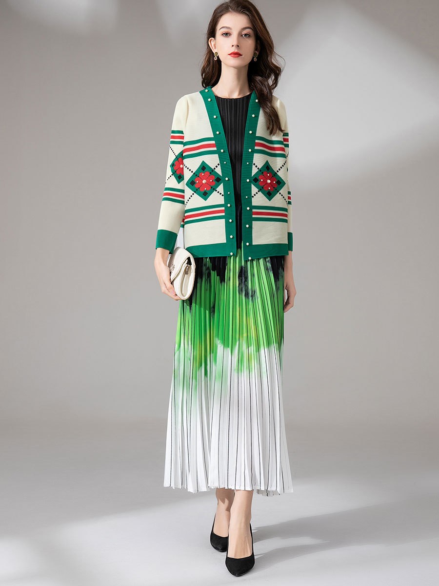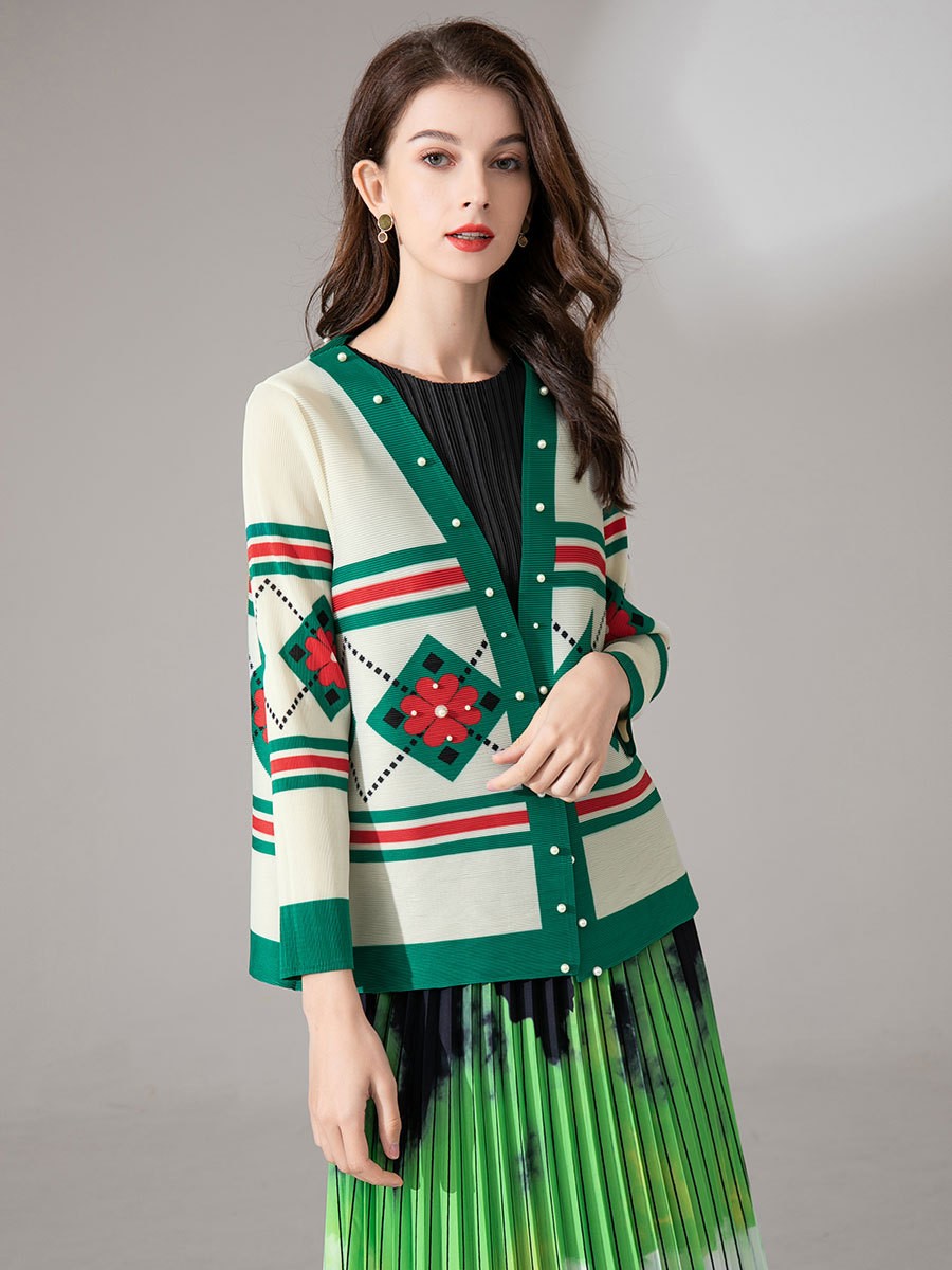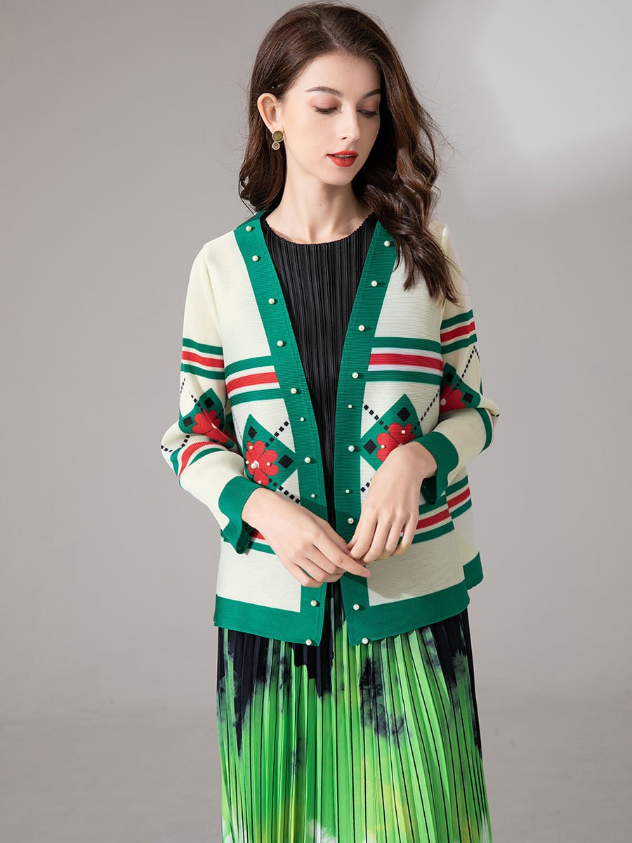 Short Coat Women's Early Autumn Pleated Window Flower Print Shawl Mom Pin Bead Long Sleeve Overlay Three House Cardigan