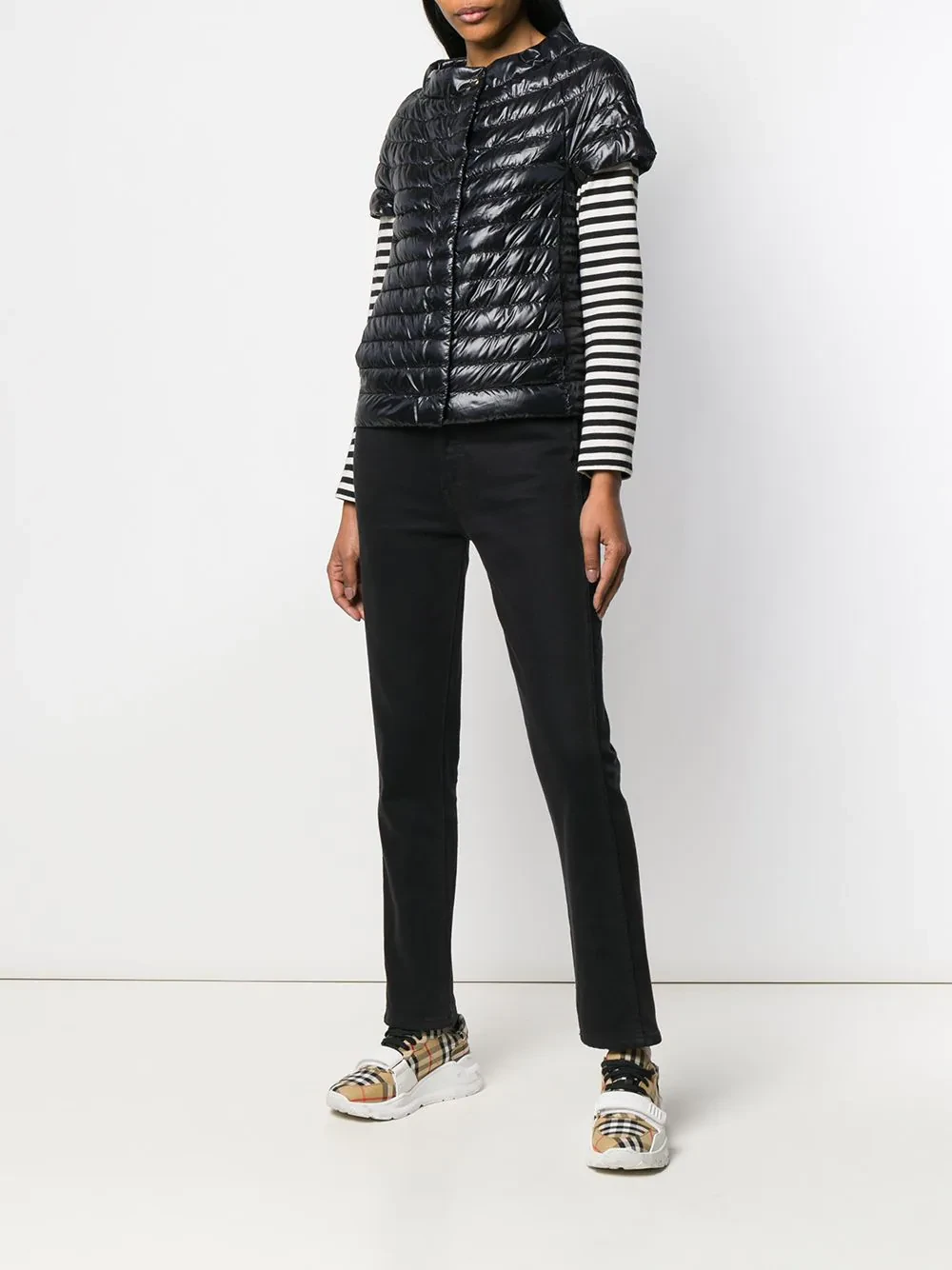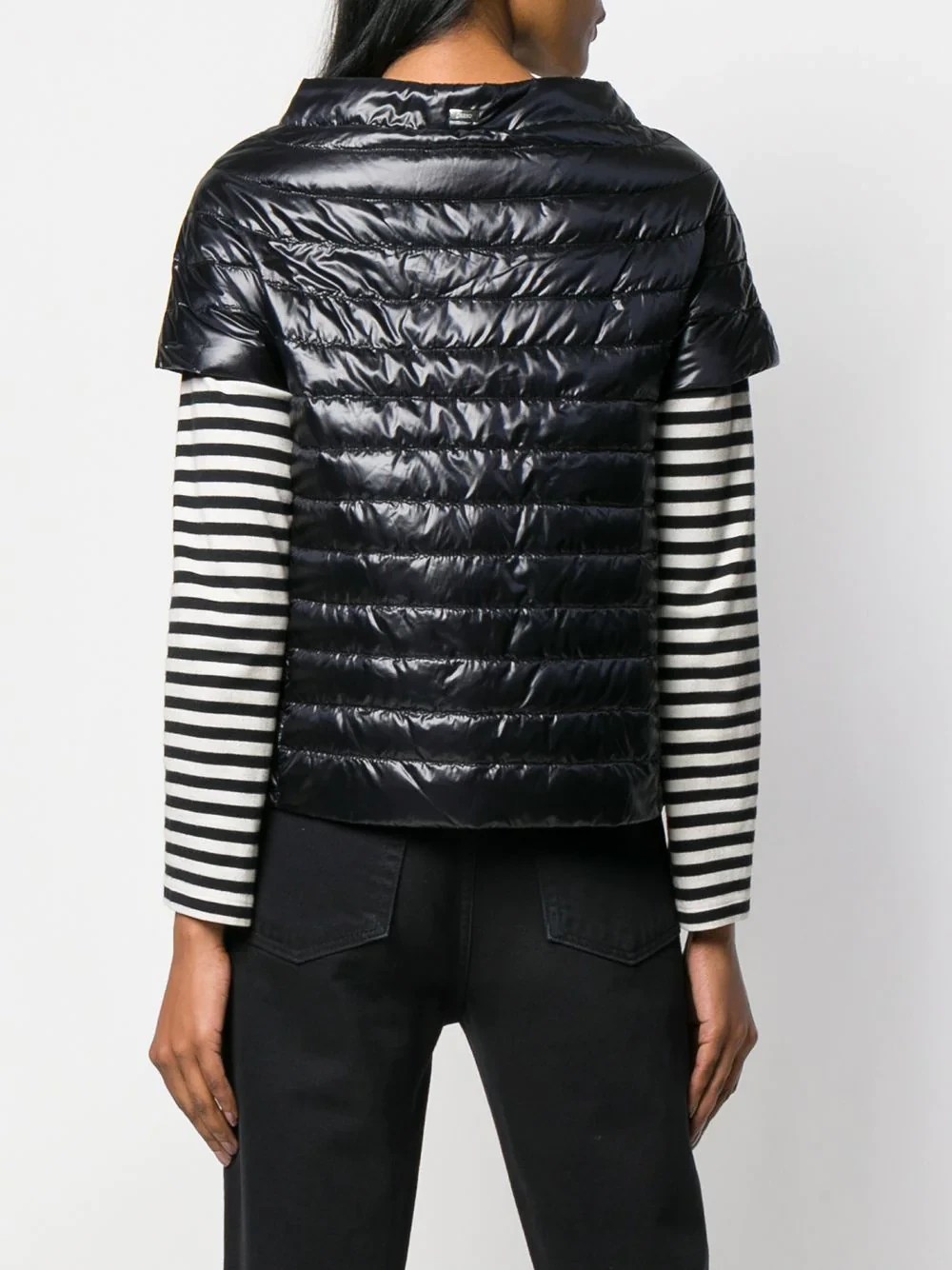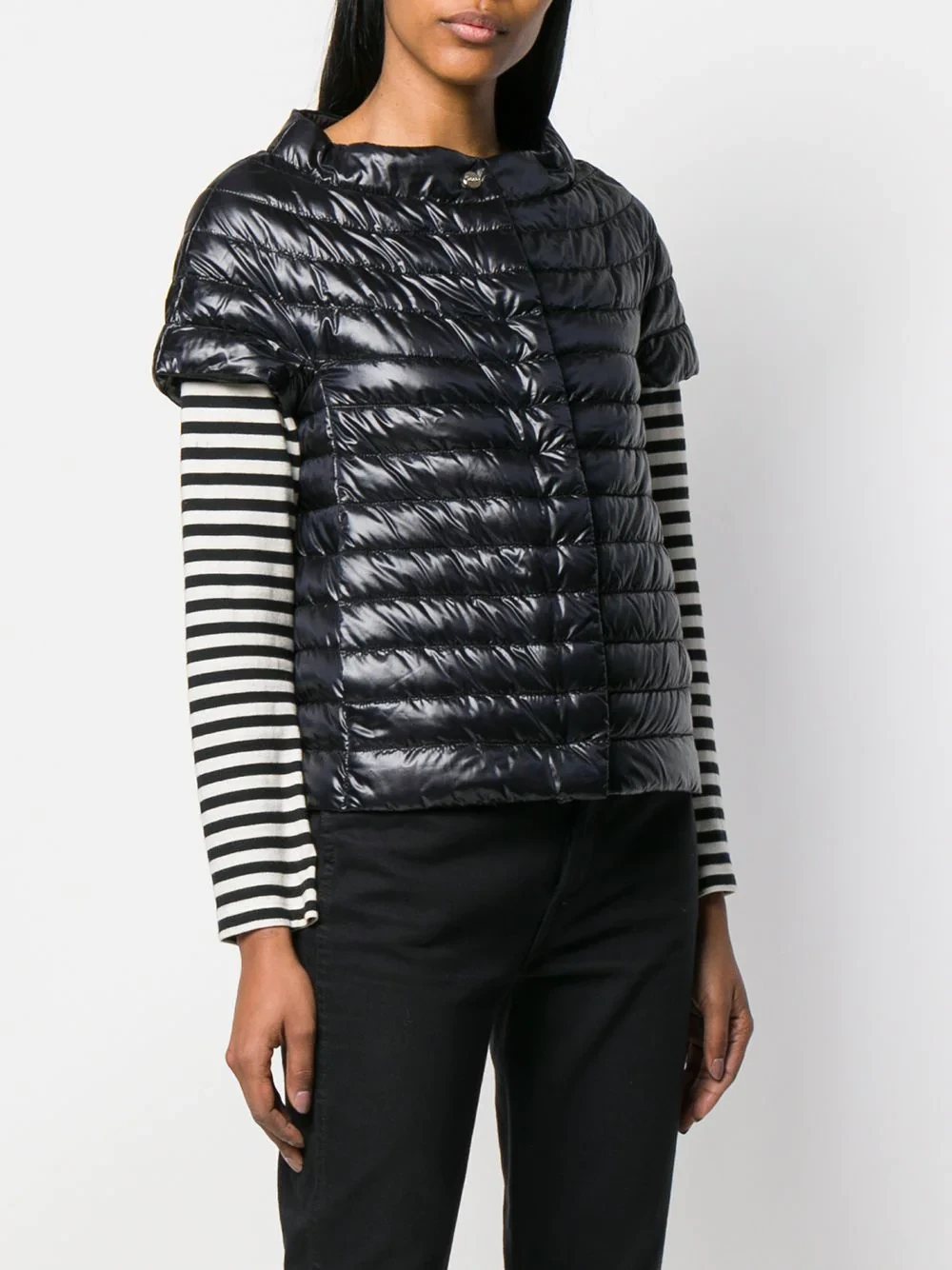 Mixing revolutionary production techniques and Italian craftsmanship tradition, Herno designs unique pieces for the harshest winters. This black cotton blend and goose down shortsleeved padded jacket from Herno features a stand up collar, a snap button closure and a short length.