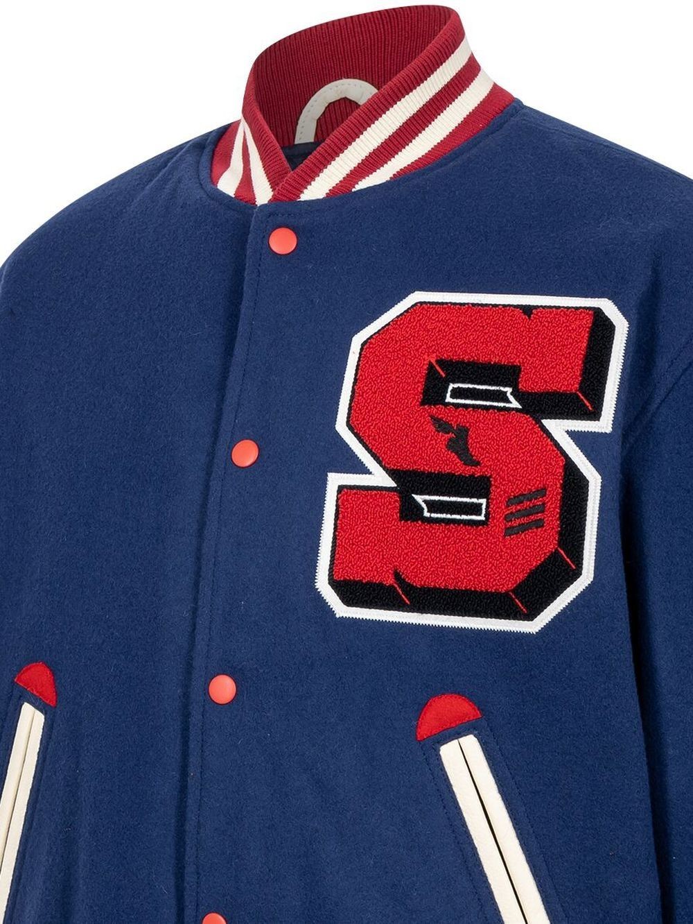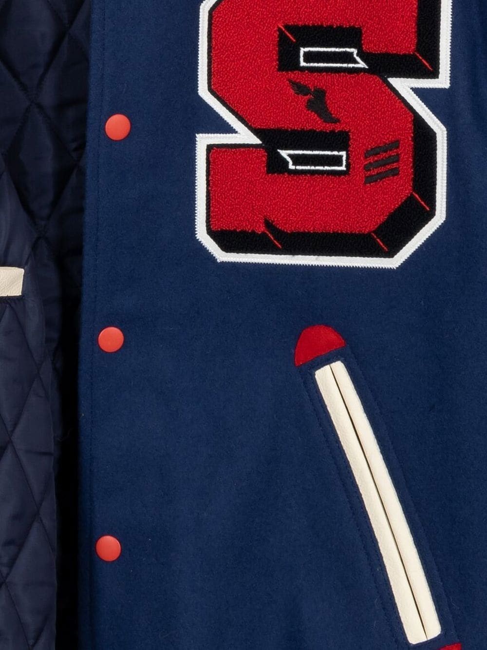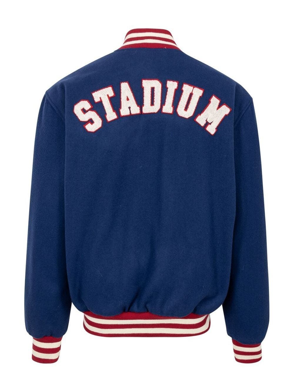 The STADIUM Home Team varsity jacket “Navy” is a modern take on the outerwear piece in a premium wool build. Here, a large red chenille 'S' patch is embroidered on the left chest of the navy blue wool body while tonal wool sleeves give the jacket a clean design. This model comes with two front slant pockets and, on the back, a STADIUM lettering in cream chenille stands out beneath the collar. A ribbed white and red striped collar, cuffs, pockets, and hem complete the design.