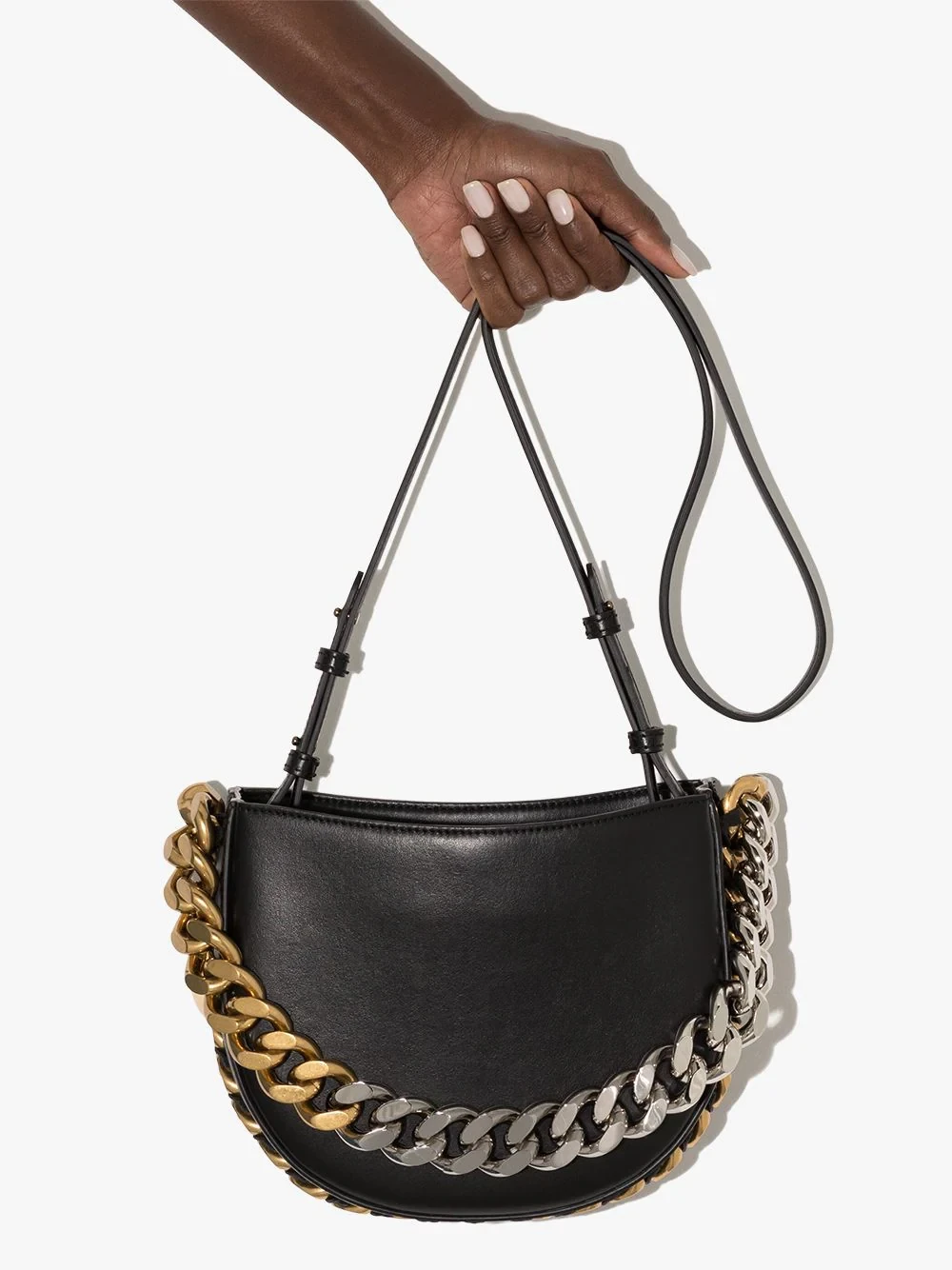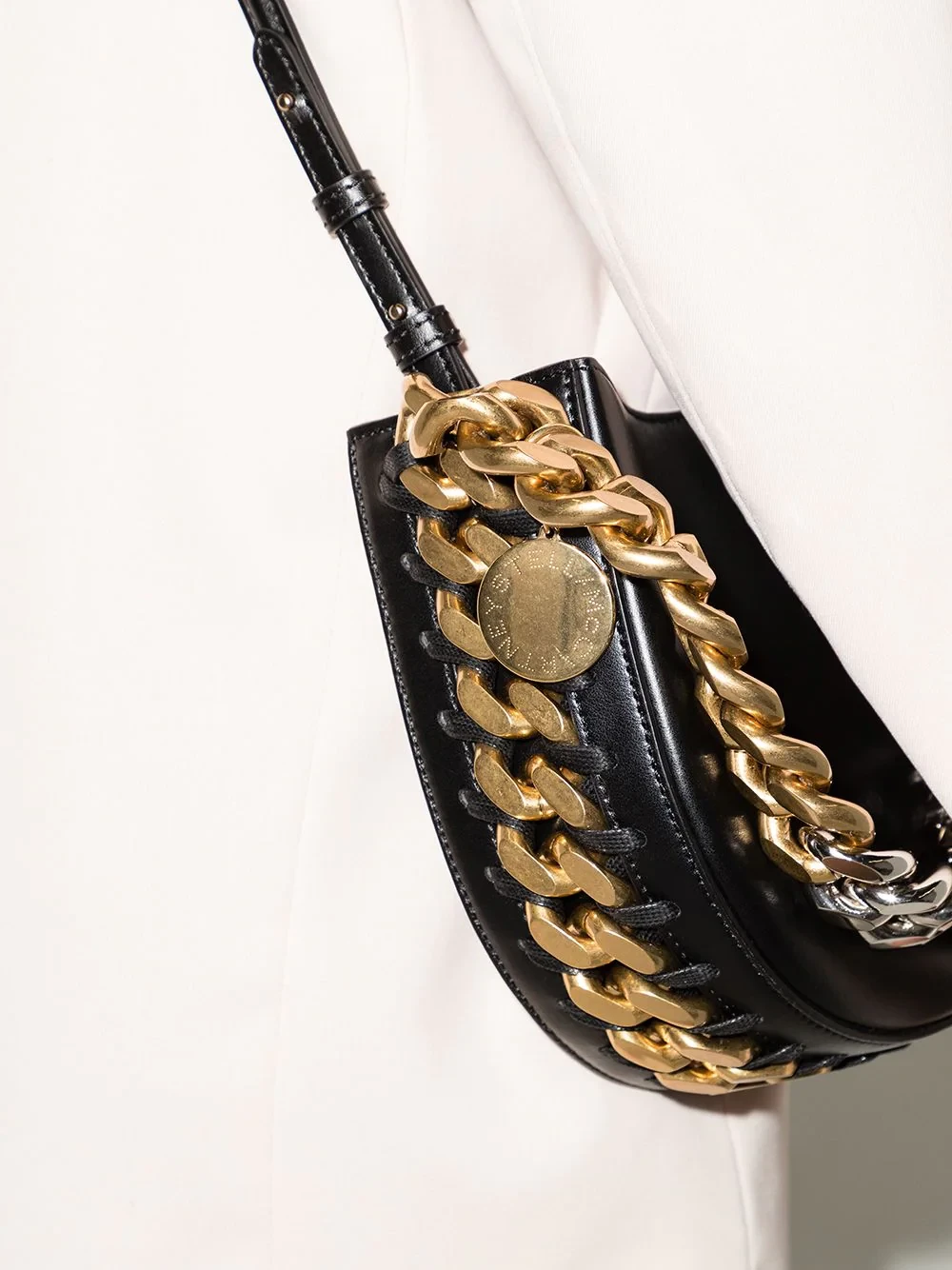 Taking brand codes from the iconic Falabella, Stella McCartney's Frayme bag is a new take of the brand's visual narrative. Crafted from faux leather, this piece is decorated with mixed-tone chains and an exaggerated version of the brand's signature medallion.