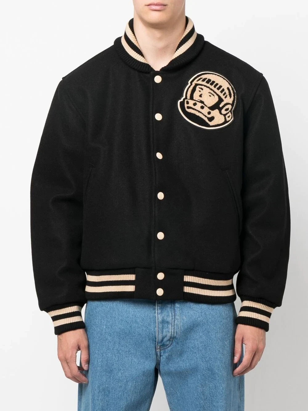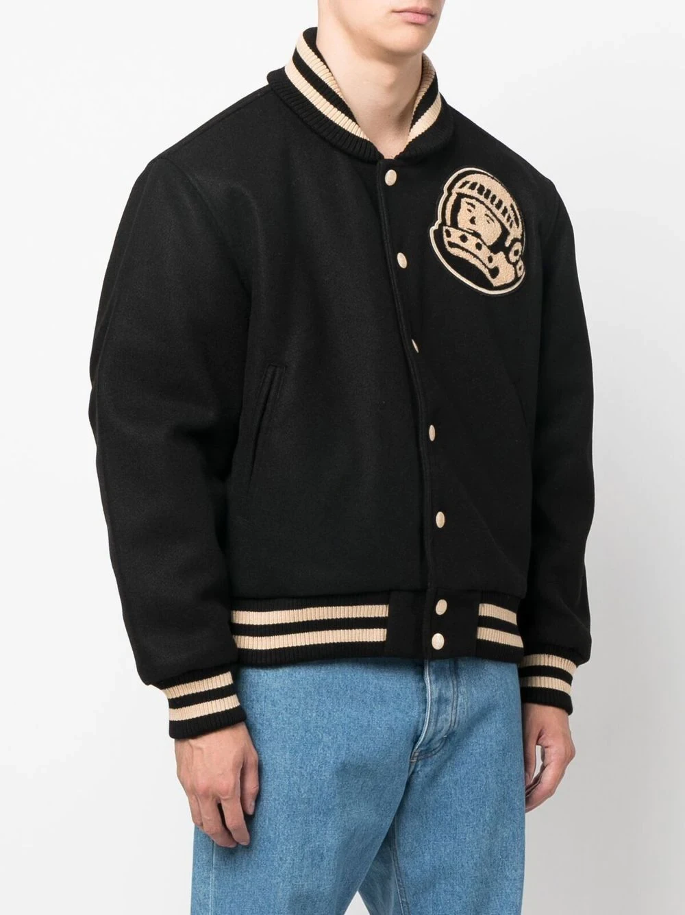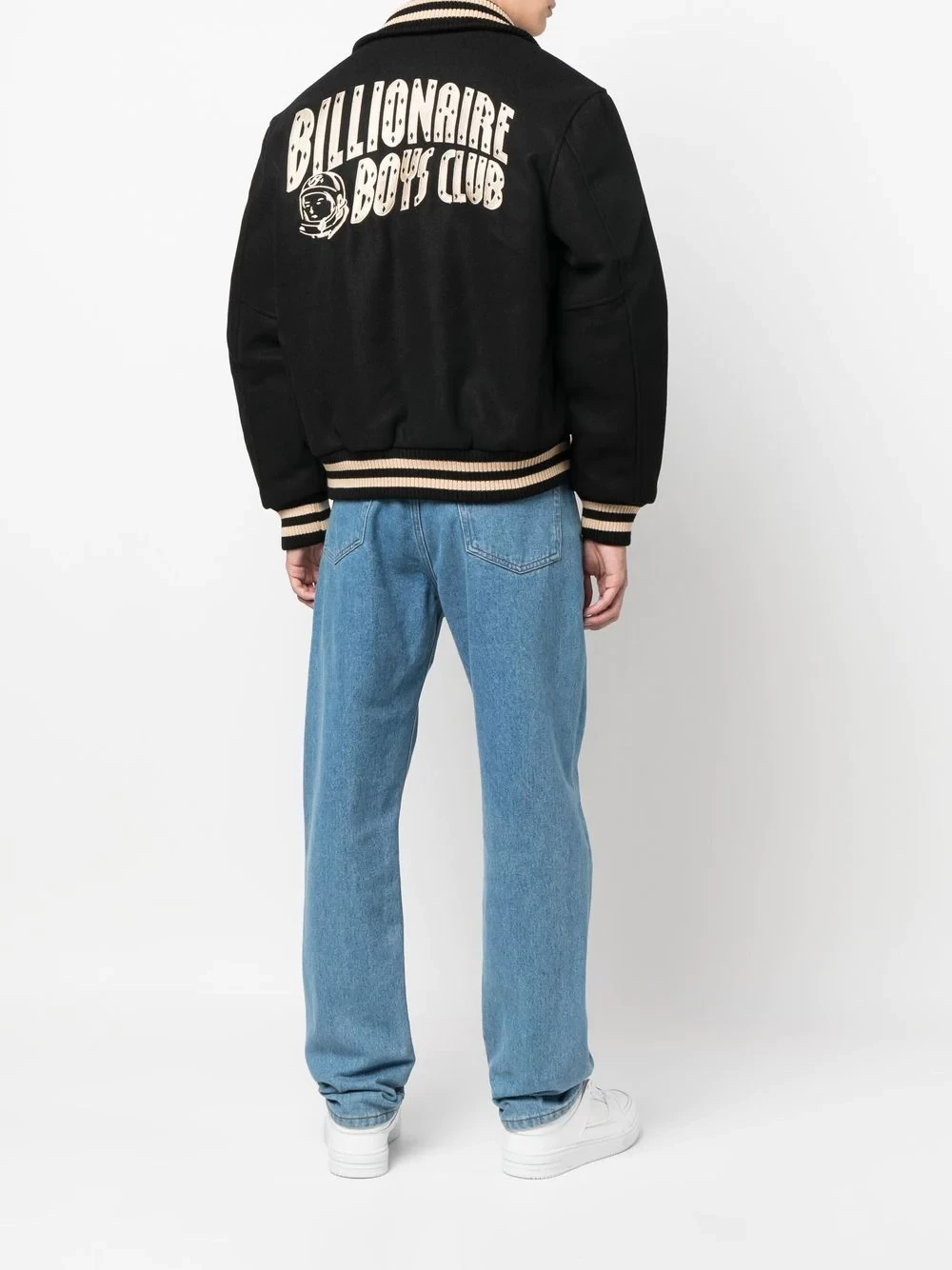 striped logo bomber-jacket from BILLIONAIRE BOYS CLUB featuring black, wool blend, stripe trim, logo patch to the rear, front press-stud fastening, long sleeves, straight hem and patch at the chest.