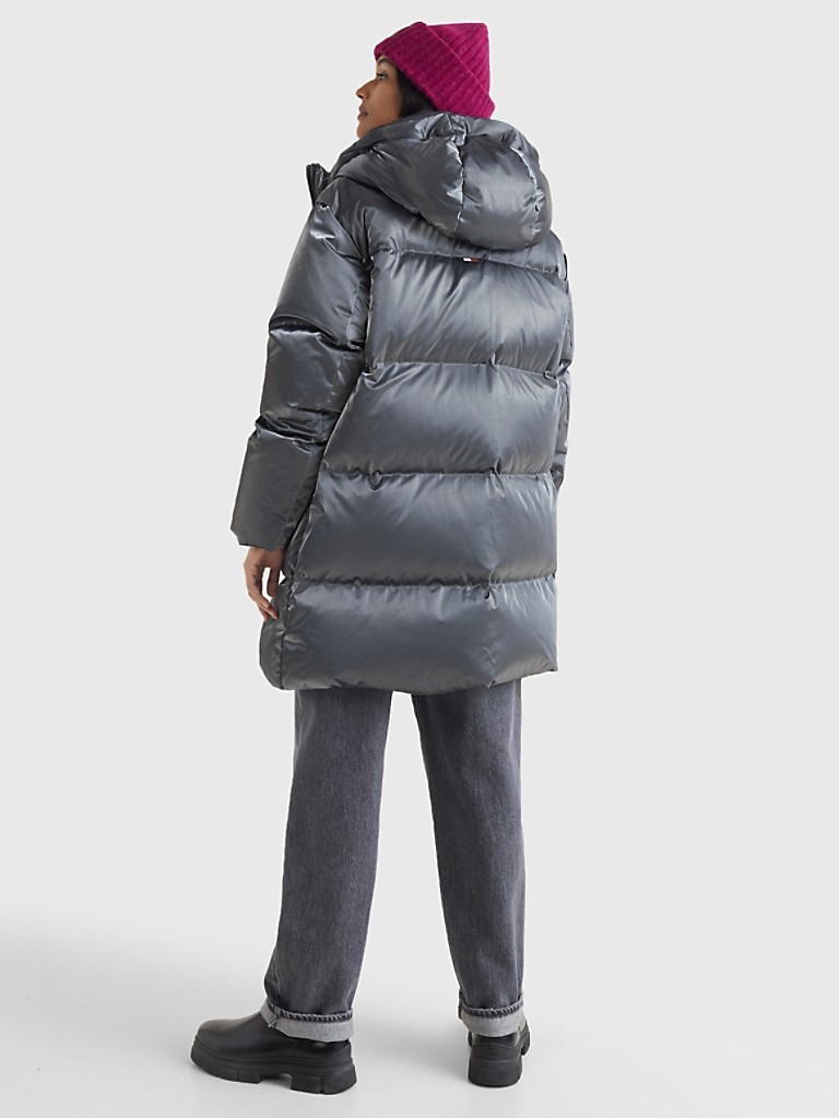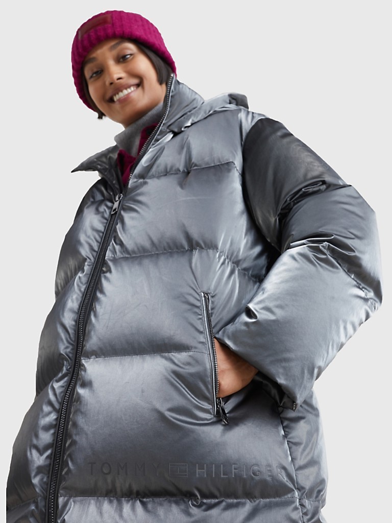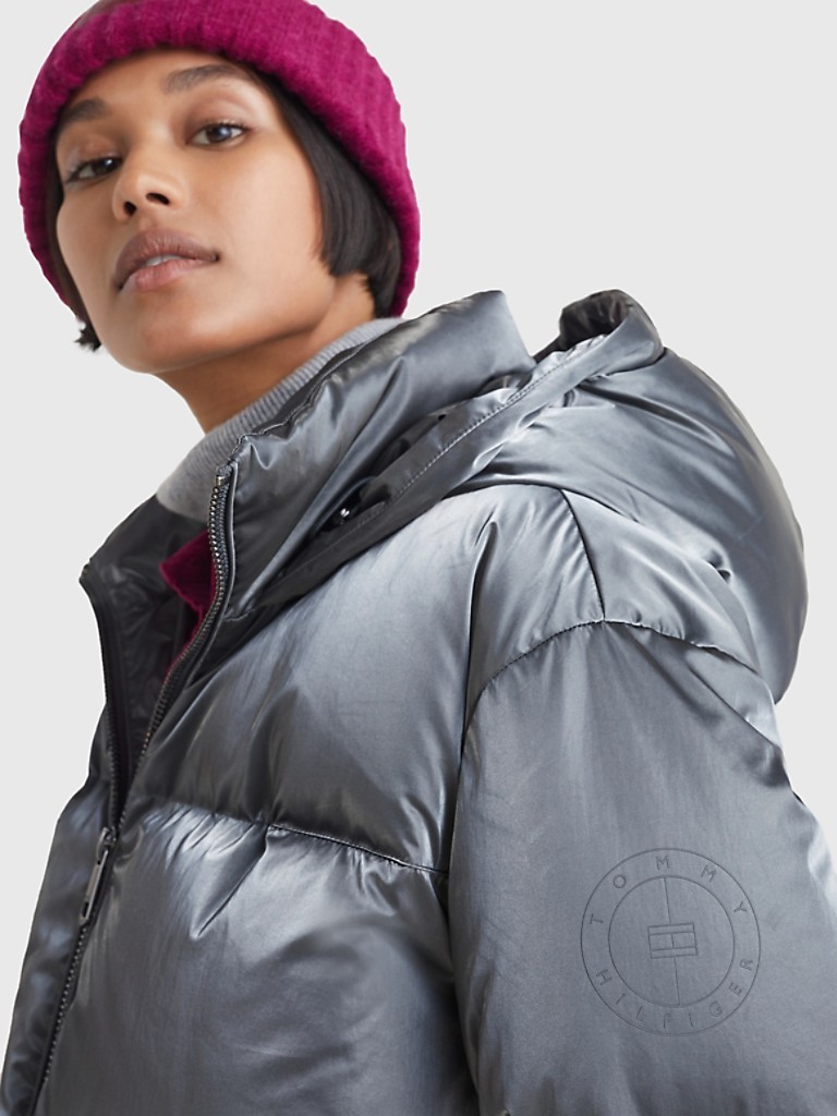 Tommy Hilfiger women's coat. Our hooded puffer with recycled duck down insulation provides superior defense against the cold. The sleek, sturdy design features a metallic crunch foil shell and a standing collar. Inspired by our heritage, but designed for tomorrow—our TH Monogram is a modern take on a time-honored icon.
