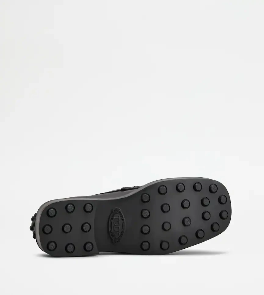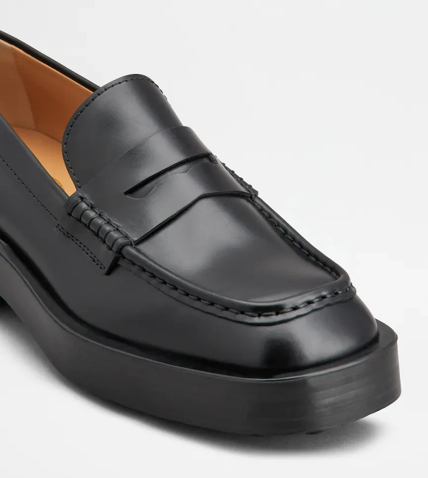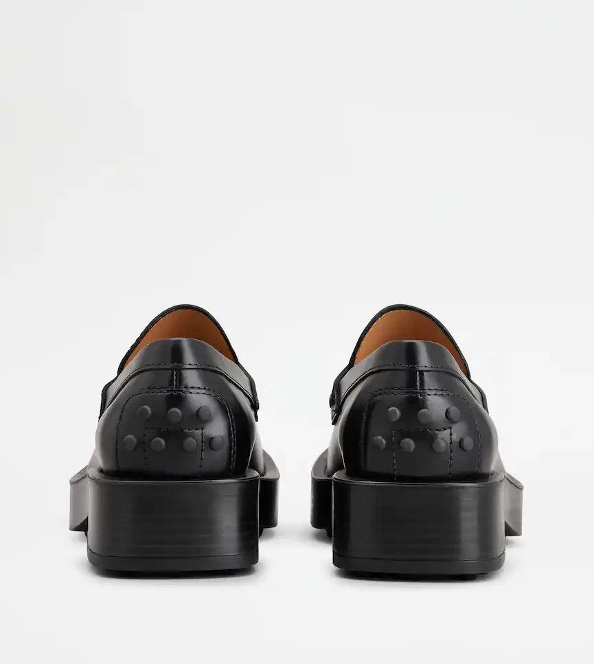 Loafers in fine smooth leather with penny bar, exposed handmade stitching, rubber pebble detailing on the heel. Characterized by a rubber outsole with embossed rubber pebbles, they interpret an informal and casual elegance.