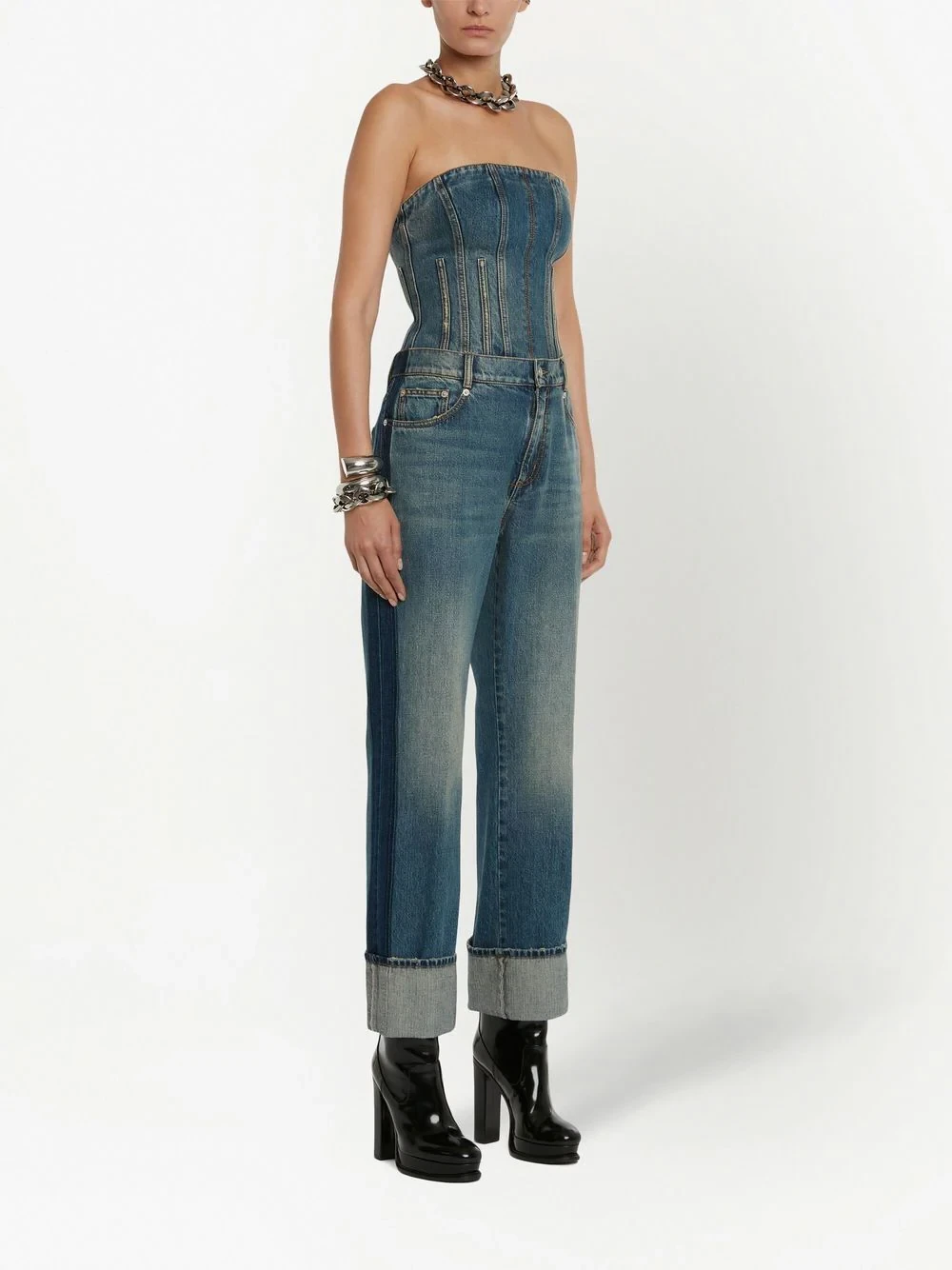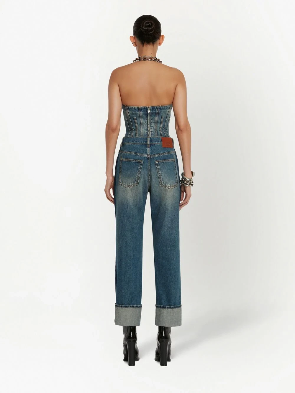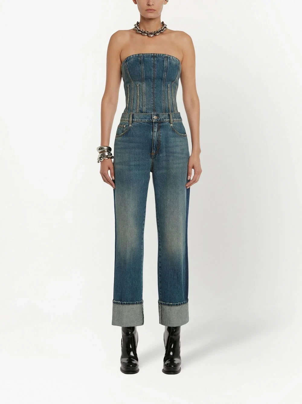 Cut for a loose straight fit, these Alexander McQueen jeans are presented in a blue colourway with a distressed denim wash. A wide turn-up hem adds an interesting touch to the classic silhouette.