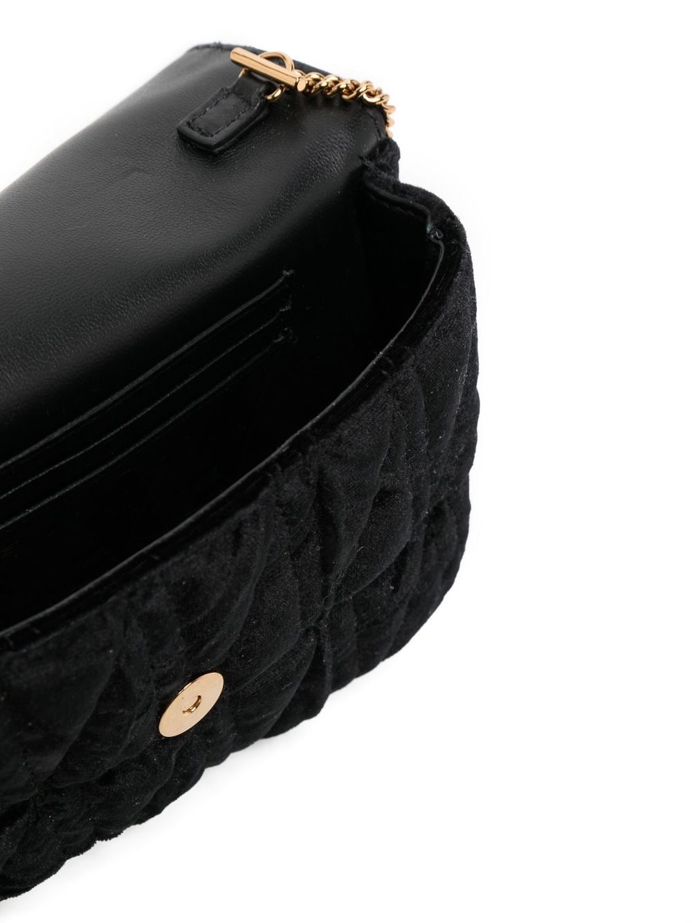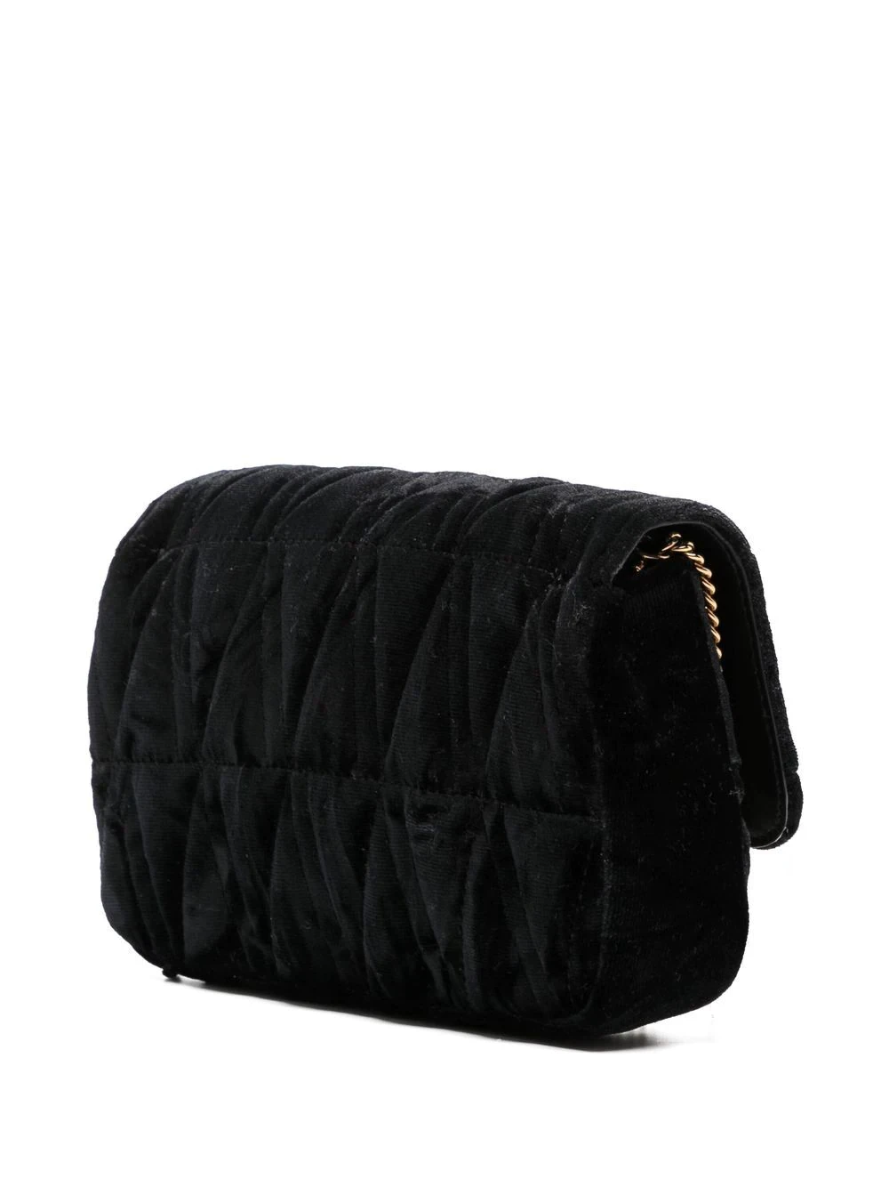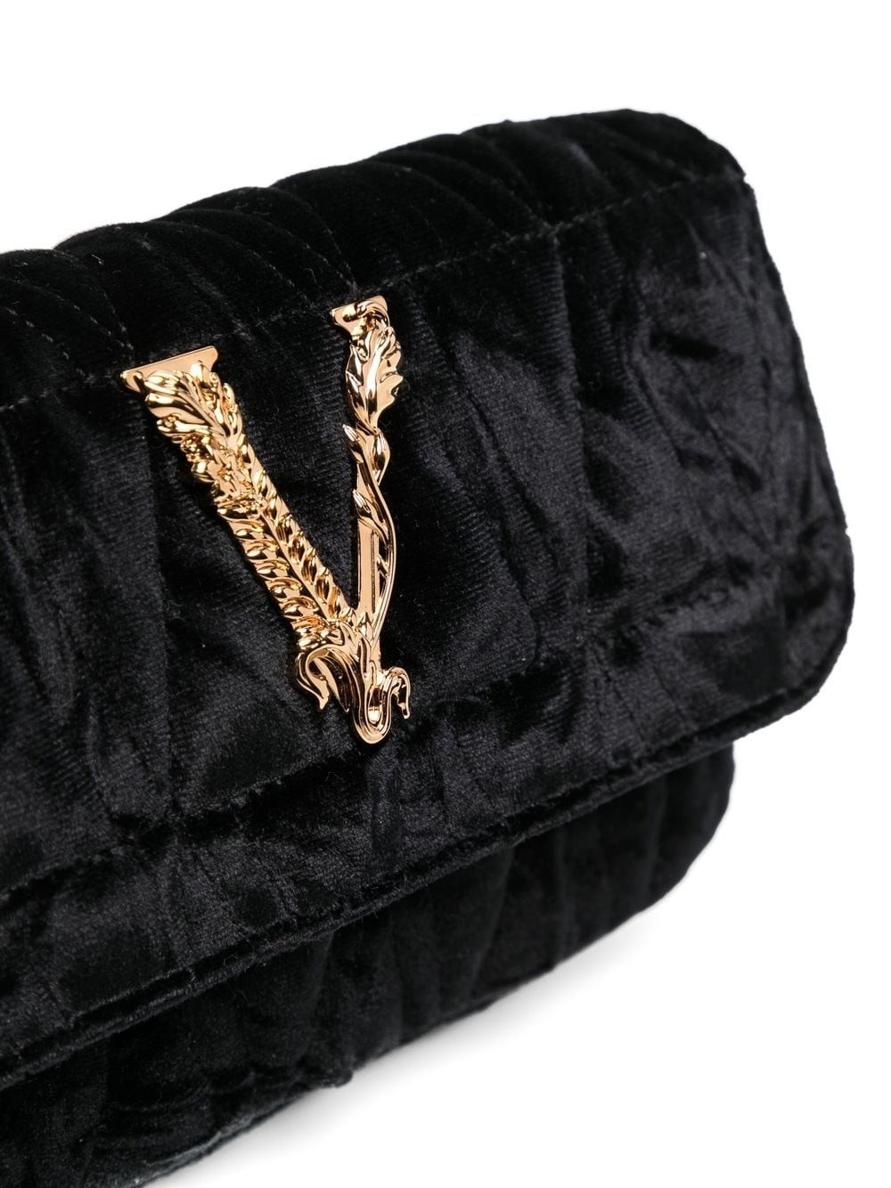 Stamped front and centre with a Barocco V with engraved acanthus leaf detailing, this Versace Virtus mini bag is made from textured velvet with a quilted V-pattern. A gold-tone chain strap completes the design.