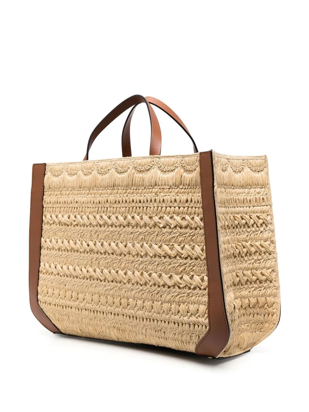 VLogo Signature embroidered raffia tote bag from VALENTINO GARAVANI featuring beige, brown, calf leather, straw, woven raffia design, maxi VLogo Signature, gold-tone hardware, tonal stitching, two rounded top handles, open top, main compartment, internal slip pocket and internal logo stamp.