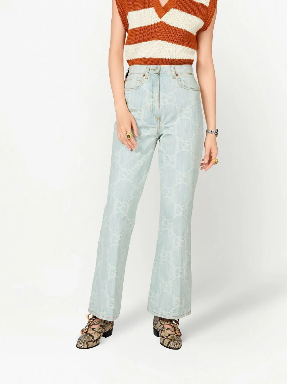 Gucci's signature GG pattern is prominent across all collections. It is also found on these wide-leg jeans which are presented in a light blue colourway with the notable design throughout.