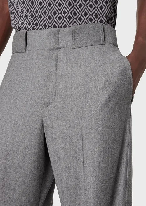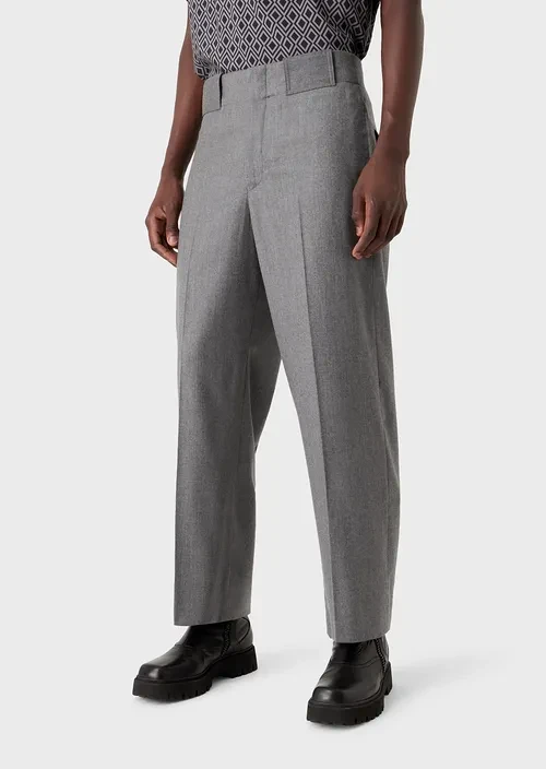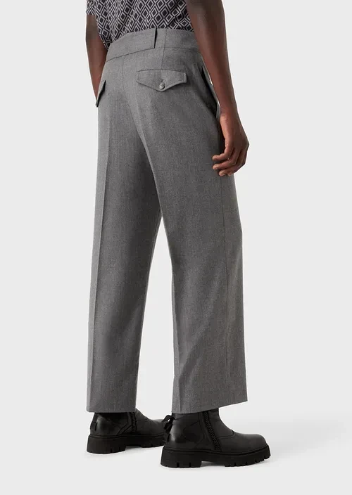 The wide, straight fit of these trousers provides the comfort of a palazzo style. The virgin wool and cashmere blend fabric makes them even more comfortable and exclusive. Oversized belt loops and adjustable ankle cuffs with buttons.