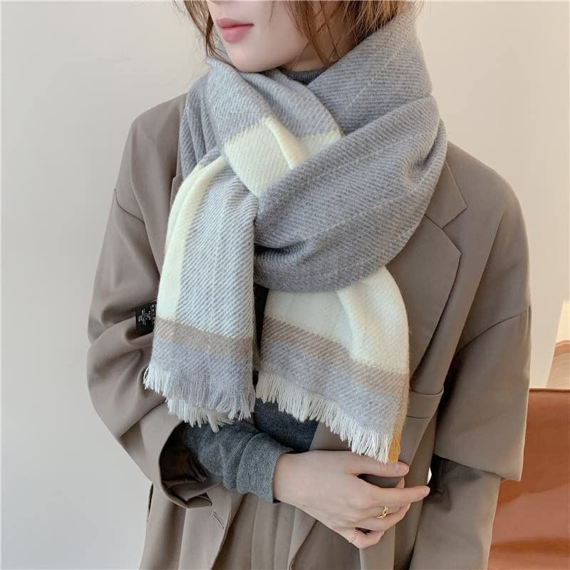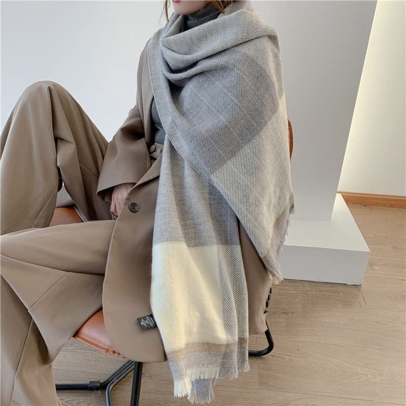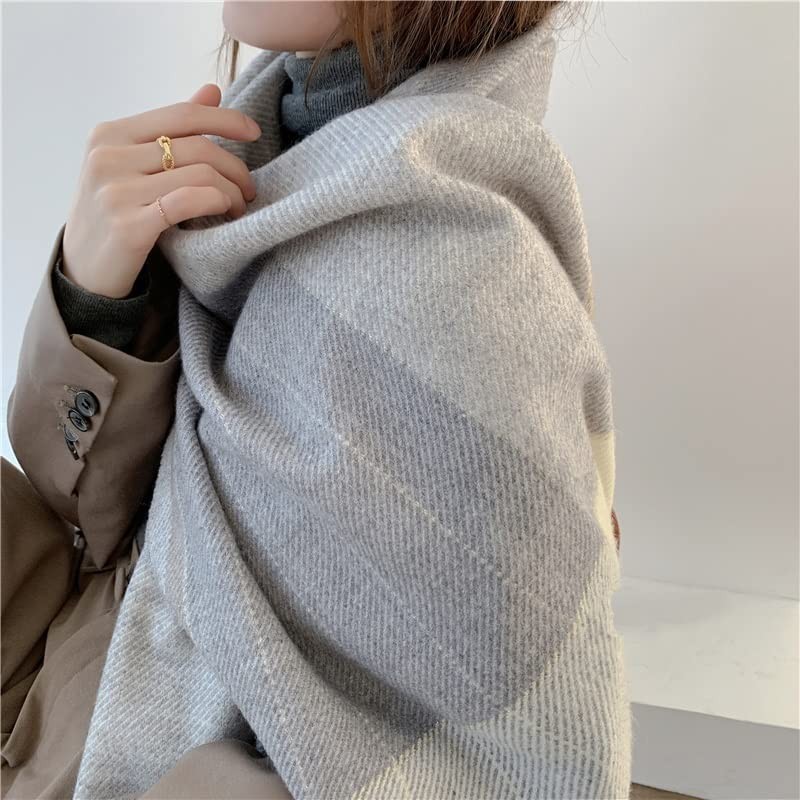 WSJIE Women Colors Matching Big Plaid Scarf Grey Soft Imitaion Burrs Big Blanket Shawl