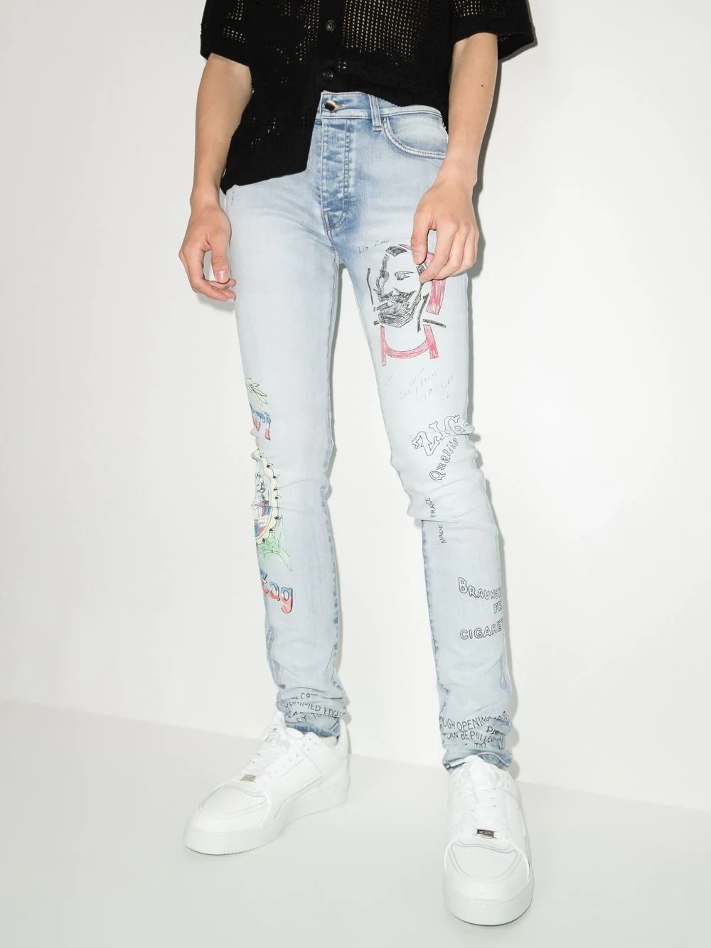 AMIRI teamed up with Zig-Zag - a French rolling paper brand, for their latest collaboration this season. These jeans from the collection are decorated with illustration-style motifs based on Zig-Zag's advertising.