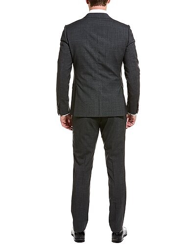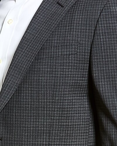Design details: notch lapel, left chest pocket, two front pockets, non-functioning buttons at cuffs, three interior pockets, and side vents at hem